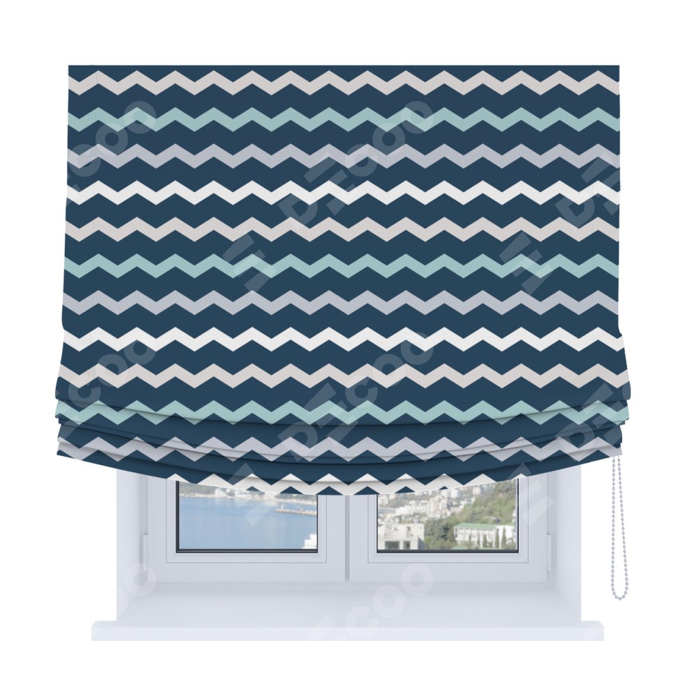 Римская штора Soft производителя «Cortin», используется для проёма, пошита из ткани блэкаут с нанесением сублимационной печати «Морской шеврон». Имеет универсальный механизм и подходит для монтажа: на потолок, на стену и в нишу. В отличие от стандартных римских штор, римская штора Soft не имеет горизонтальных вставок и нижнего отвеса. Это позволяет ткани произвольно драпироваться в свободные мягкие складки.