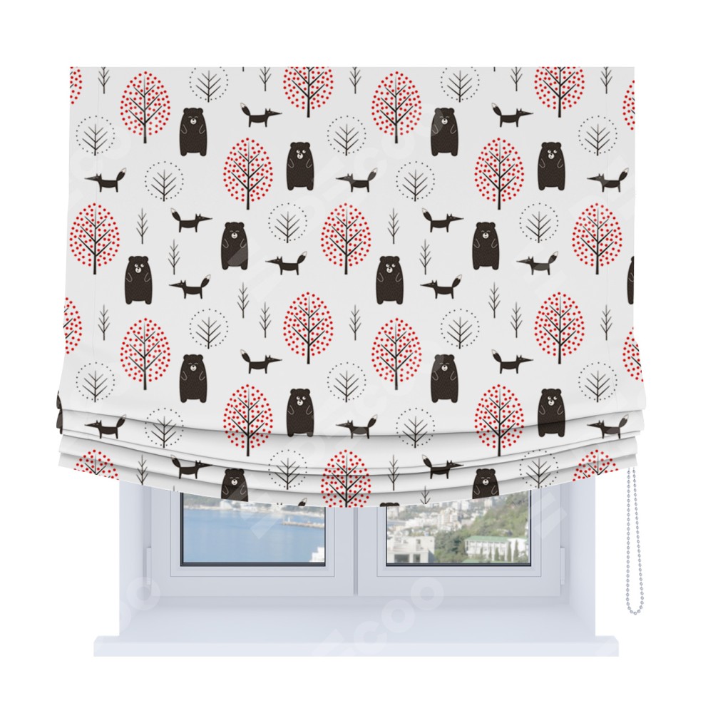 Римская штора Soft производителя «Cortin», используется для проёма, пошита из ткани блэкаут с нанесением сублимационной печати «Сканди лес». Имеет универсальный механизм и подходит для монтажа: на потолок, на стену и в нишу. В отличие от стандартных римских штор, римская штора Soft не имеет горизонтальных вставок и нижнего отвеса. Это позволяет ткани произвольно драпироваться в свободные мягкие складки.