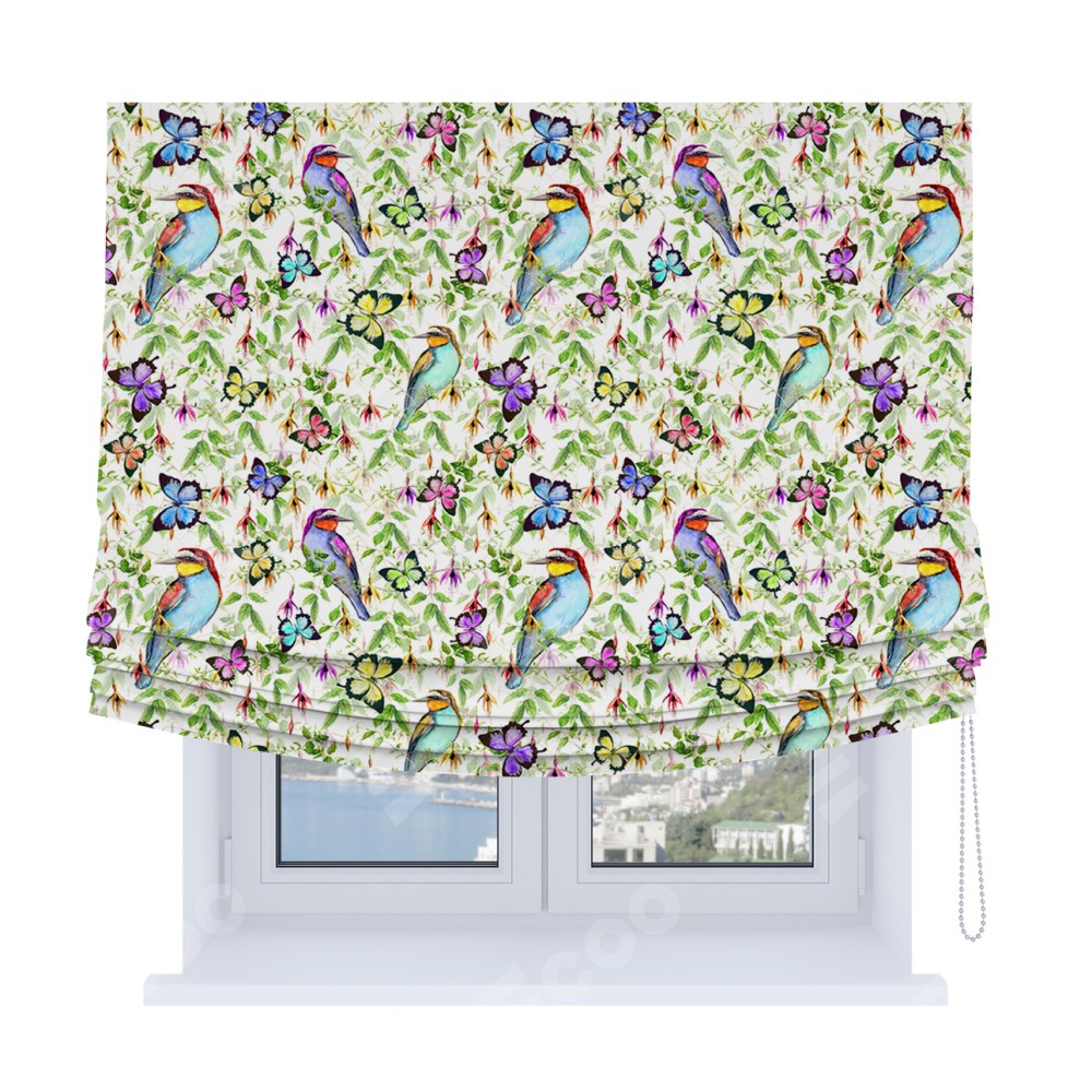 Римская штора Soft производителя «Cortin», используется для проёма, пошита из ткани блэкаут с нанесением сублимационной печати «Тропические птицы». Имеет универсальный механизм и подходит для монтажа: на потолок, на стену и в нишу. В отличие от стандартных римских штор, римская штора Soft не имеет горизонтальных вставок и нижнего отвеса. Это позволяет ткани произвольно драпироваться в свободные мягкие складки.