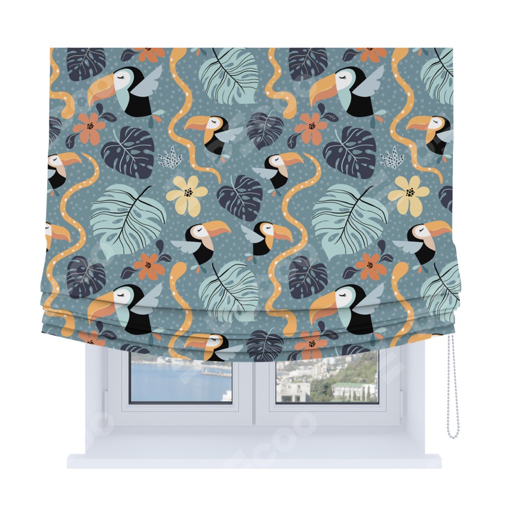 Римская штора Soft производителя «Cortin», используется для проёма, пошита из ткани блэкаут с нанесением сублимационной печати «Экзотические птицы». Имеет универсальный механизм и подходит для монтажа: на потолок, на стену и в нишу. В отличие от стандартных римских штор, римская штора Soft не имеет горизонтальных вставок и нижнего отвеса. Это позволяет ткани произвольно драпироваться в свободные мягкие складки.