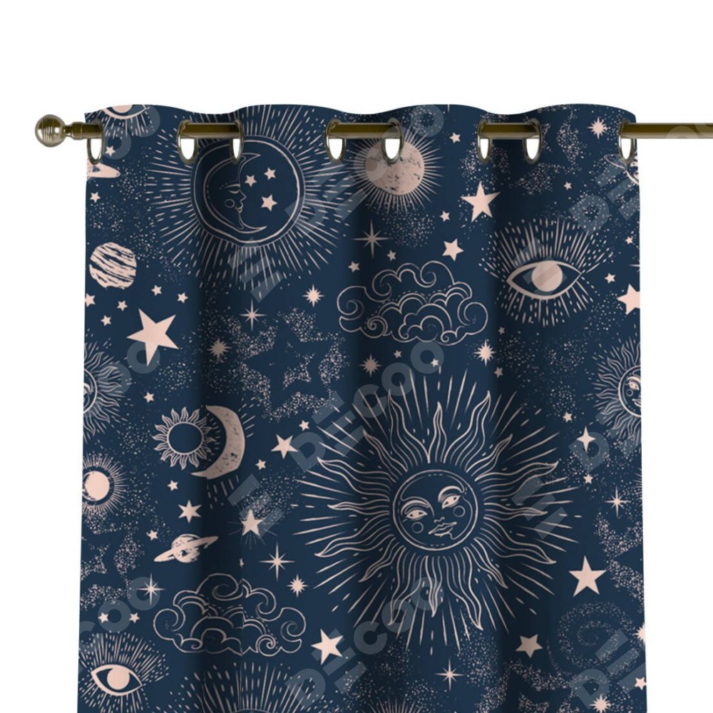 Комплект прямых штор, от производителя «Cortin», пошиты из ткани блэкаут с нанесением сублимационной печати «Звёзды и планеты». Данная модель пошита на люверсах, комплектуется на выбор круглым карнизом и подходит для монтажа на стену или потолок. Прямые шторы на люверсах шьются по стандарту с коэффициентом 1/2 (на 100 см. ширины проёма 200 см. ширины ткани), отличительным преимуществом данной модели является простой способ монтажа. Достаточно повесить ее на трубу и штора готова!