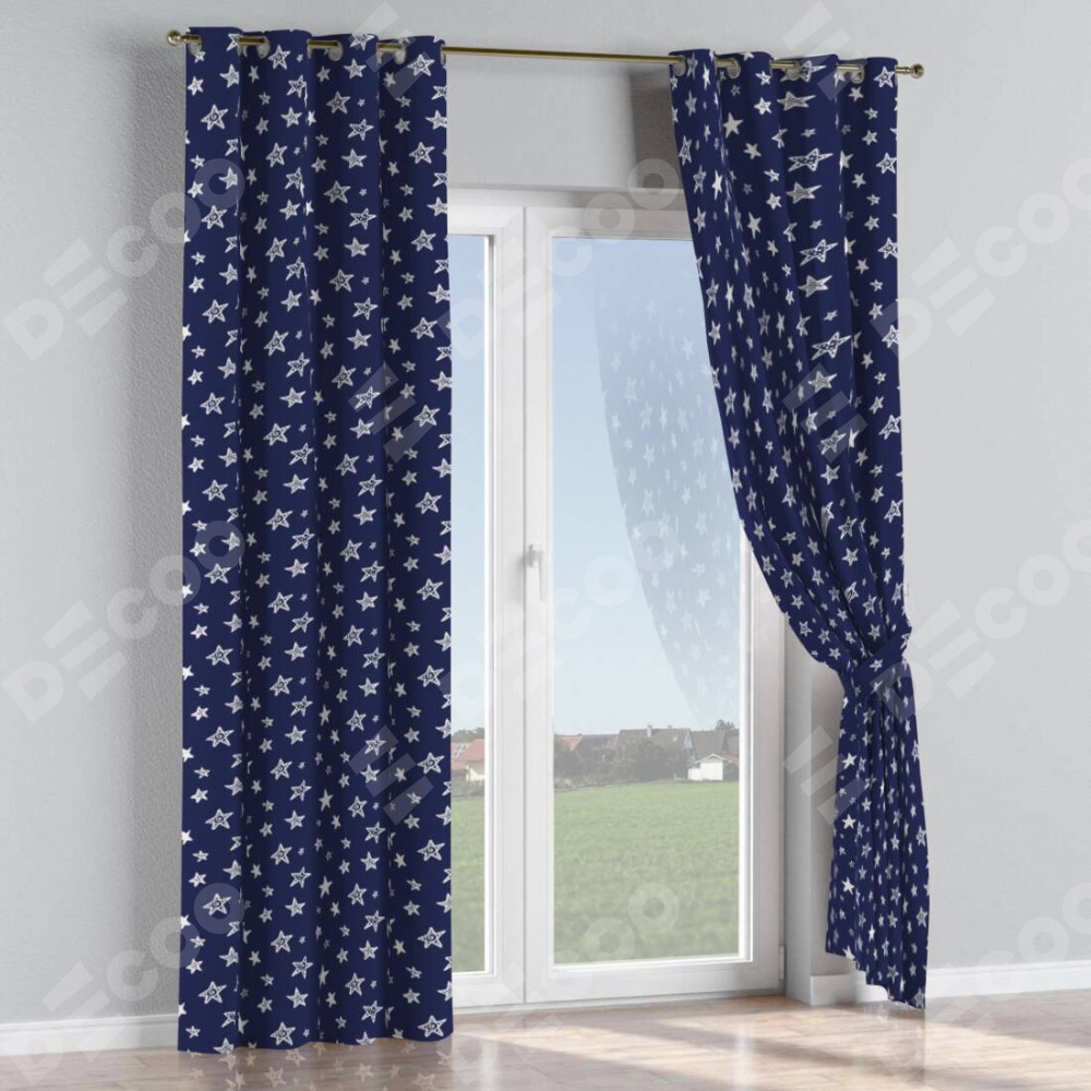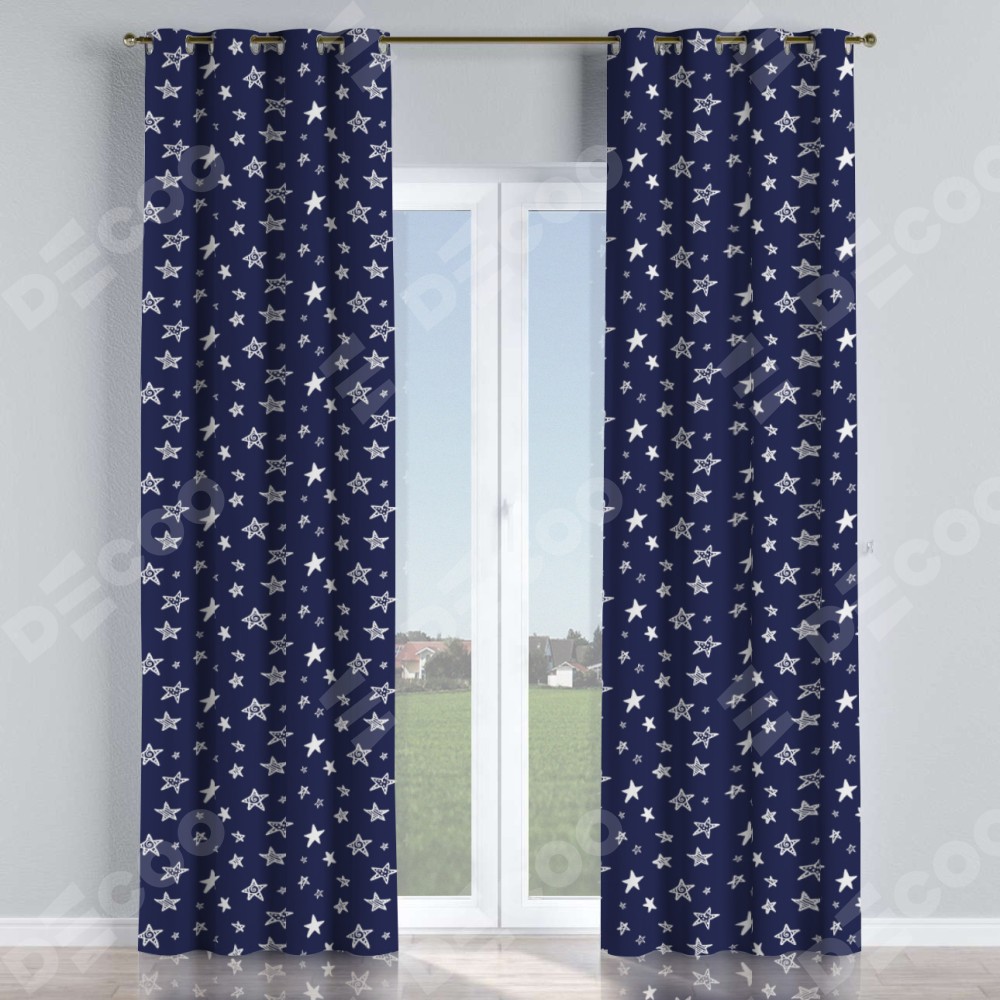 Комплект прямых штор, от производителя «Cortin», пошиты из ткани блэкаут с нанесением сублимационной печати «Ночные звёзды». Данная модель пошита на люверсах, комплектуется на выбор круглым карнизом и подходит для монтажа на стену или потолок. Прямые шторы на люверсах шьются по стандарту с коэффициентом 1/2 (на 100 см. ширины проёма 200 см. ширины ткани), отличительным преимуществом данной модели является простой способ монтажа. Достаточно повесить ее на трубу и штора готова!