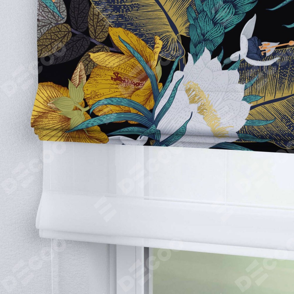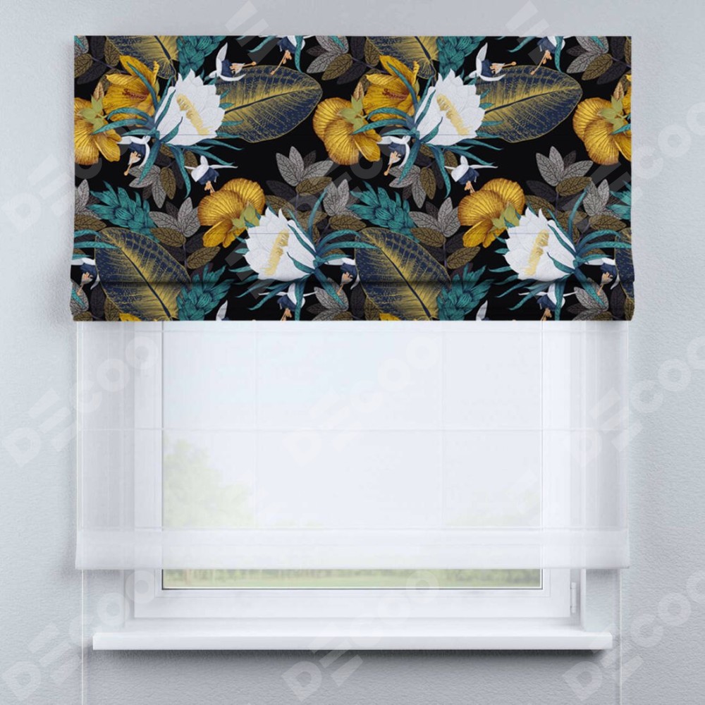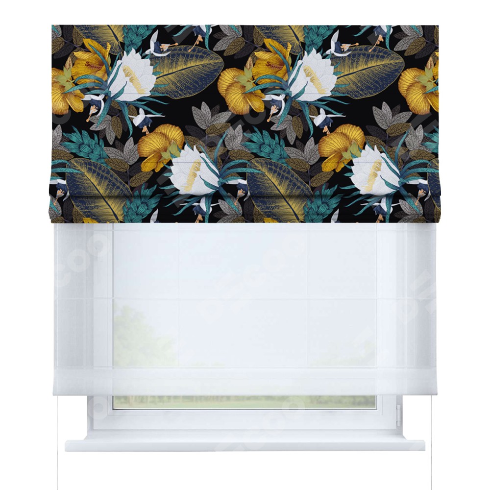 Римская штора день-ночь производителя «Cortin», используется для проёма, пошита из двух полотен, с лицевой блэкаут с нанесением сублимационной печати «Затерянный оазис», вторая ткань тюль (по стандарту комплектуется тюль белого цвета артикул V-01). Имеет универсальный механизм и подходит для монтажа: на потолок, на стену и в нишу.