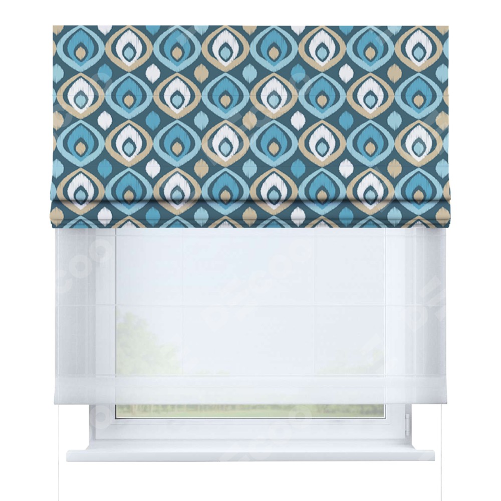 Римская штора день-ночь производителя «Cortin», используется для проёма, пошита из двух полотен, с лицевой блэкаут с нанесением сублимационной печати «Икат орнамент», вторая ткань тюль (по стандарту комплектуется тюль белого цвета артикул V-01). Имеет универсальный механизм и подходит для монтажа: на потолок, на стену и в нишу.