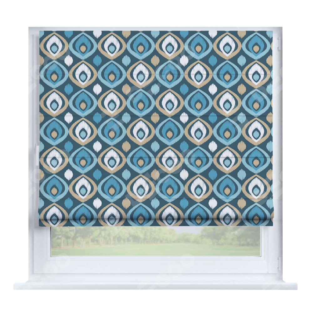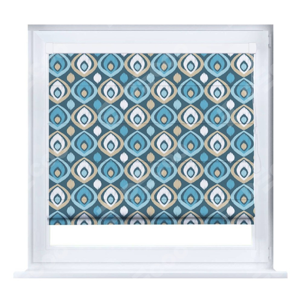 Римская штора производителя «Cortin», устанавливается на створку окна, пошита из ткани блэкаут с нанесением сублимационной печати «Икат орнамент». Штора шьётся по индивидуальным размерам, для данного типа римской шторы возможная ширина от 35 до 150 см., высота до 250 см.