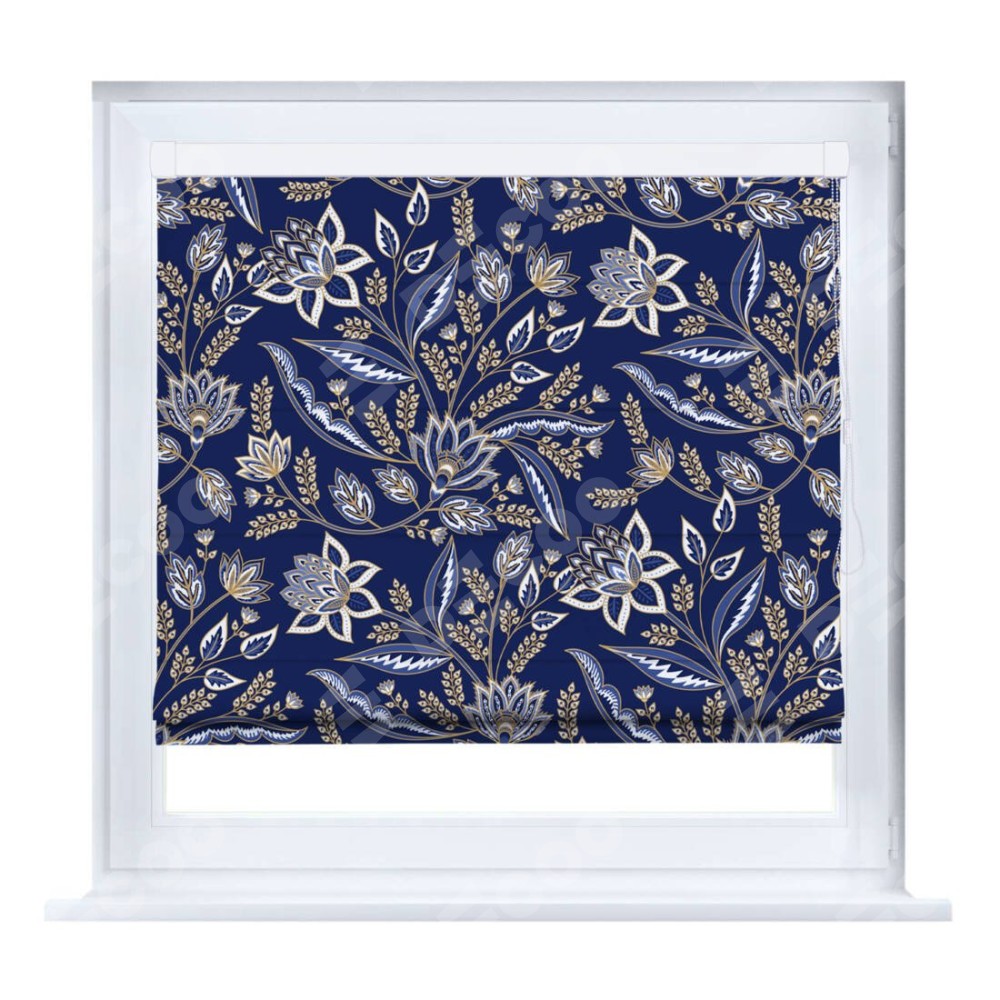 Римская штора производителя «Cortin», устанавливается на створку окна, пошита из ткани блэкаут с нанесением сублимационной печати «Индиго батик». Штора шьётся по индивидуальным размерам, для данного типа римской шторы возможная ширина от 35 до 150 см., высота до 250 см.