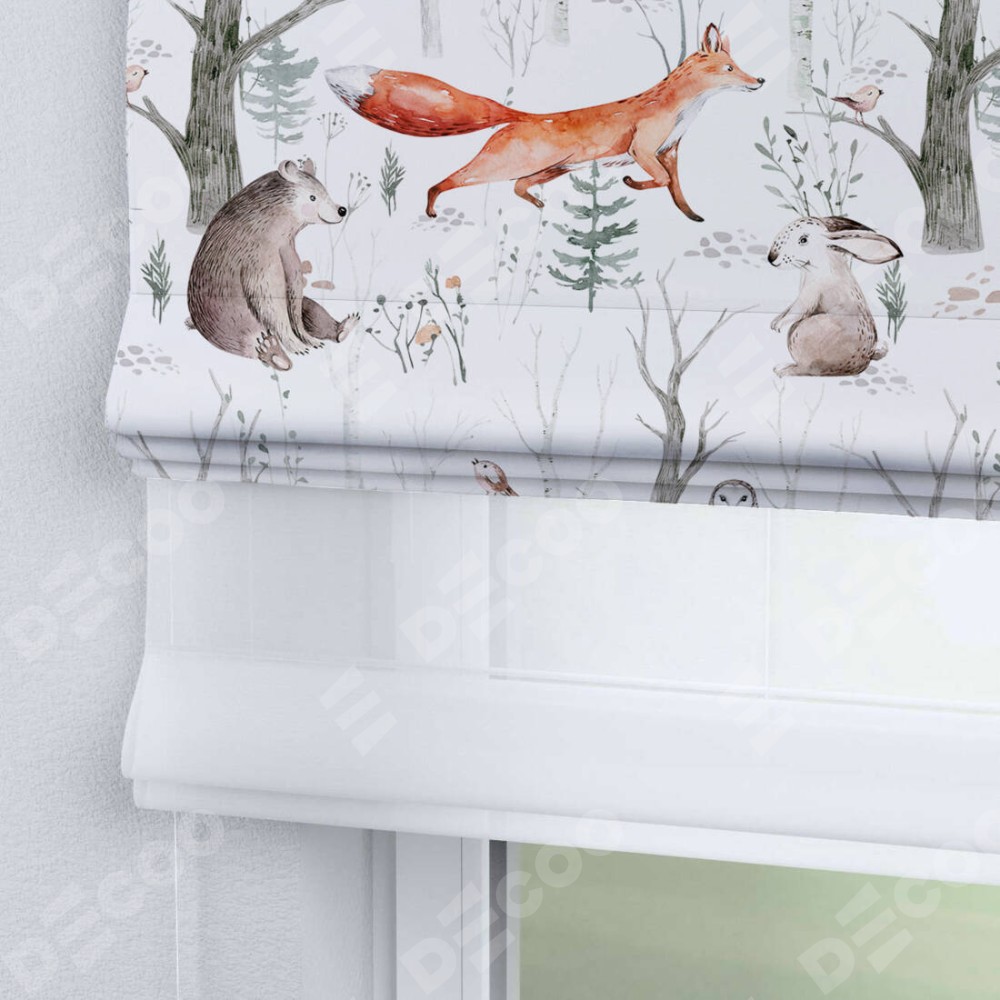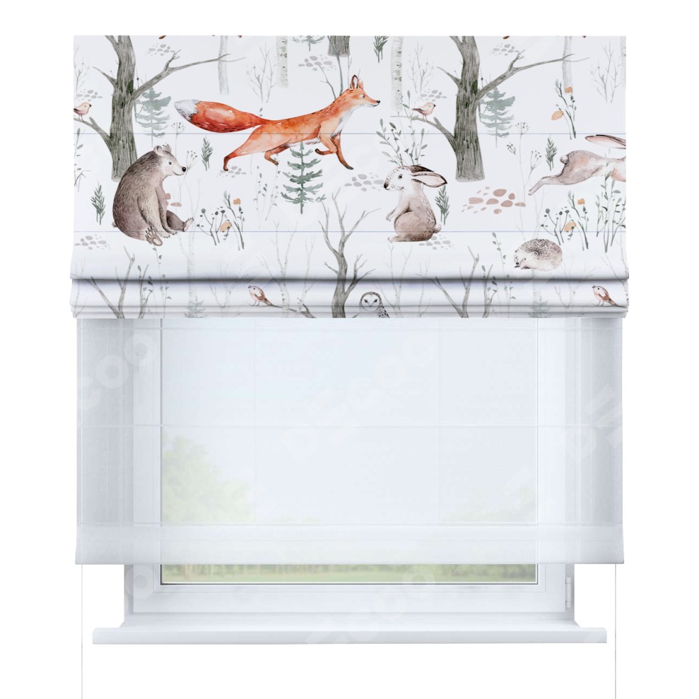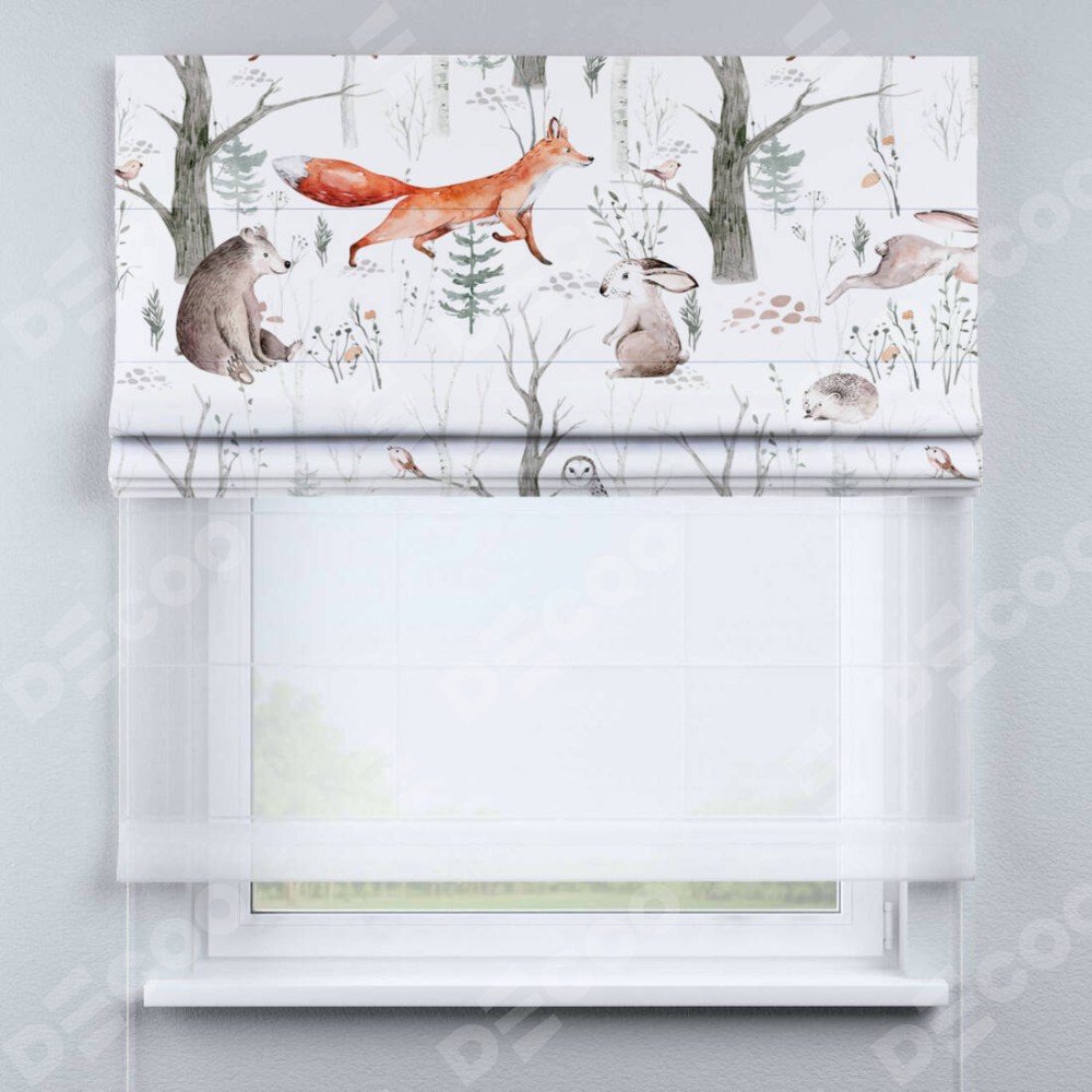 Римская штора день-ночь производителя «Cortin», используется для проёма, пошита из двух полотен, с лицевой блэкаут с нанесением сублимационной печати «Лесной питомник», вторая ткань тюль (по стандарту комплектуется тюль белого цвета артикул V-01). Имеет универсальный механизм и подходит для монтажа: на потолок, на стену и в нишу.