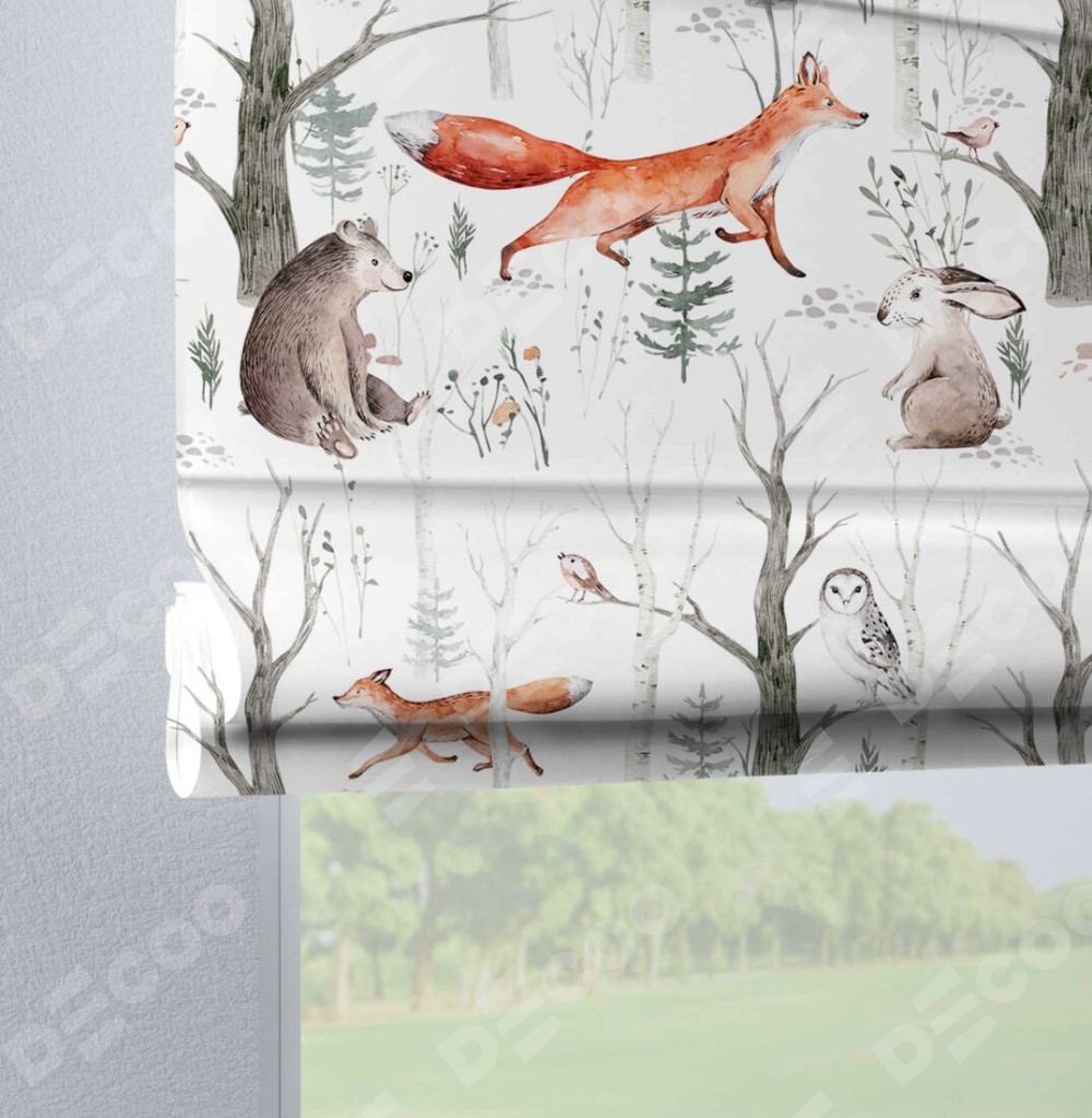 Римская штора производителя «Cortin», используется для проёма, пошита из ткани блэкаут с нанесением сублимационной печати «Лесной питомник». Данная модель пошита на петлях, комплектуется на выбор круглым карнизом и подходит для монтажа на стену. Римская штора на петлях имеет простую систему регулировки высоты, отличительным преимуществом данной модели является простой способ монтажа. Достаточно повесить ее на трубу и штора готова!