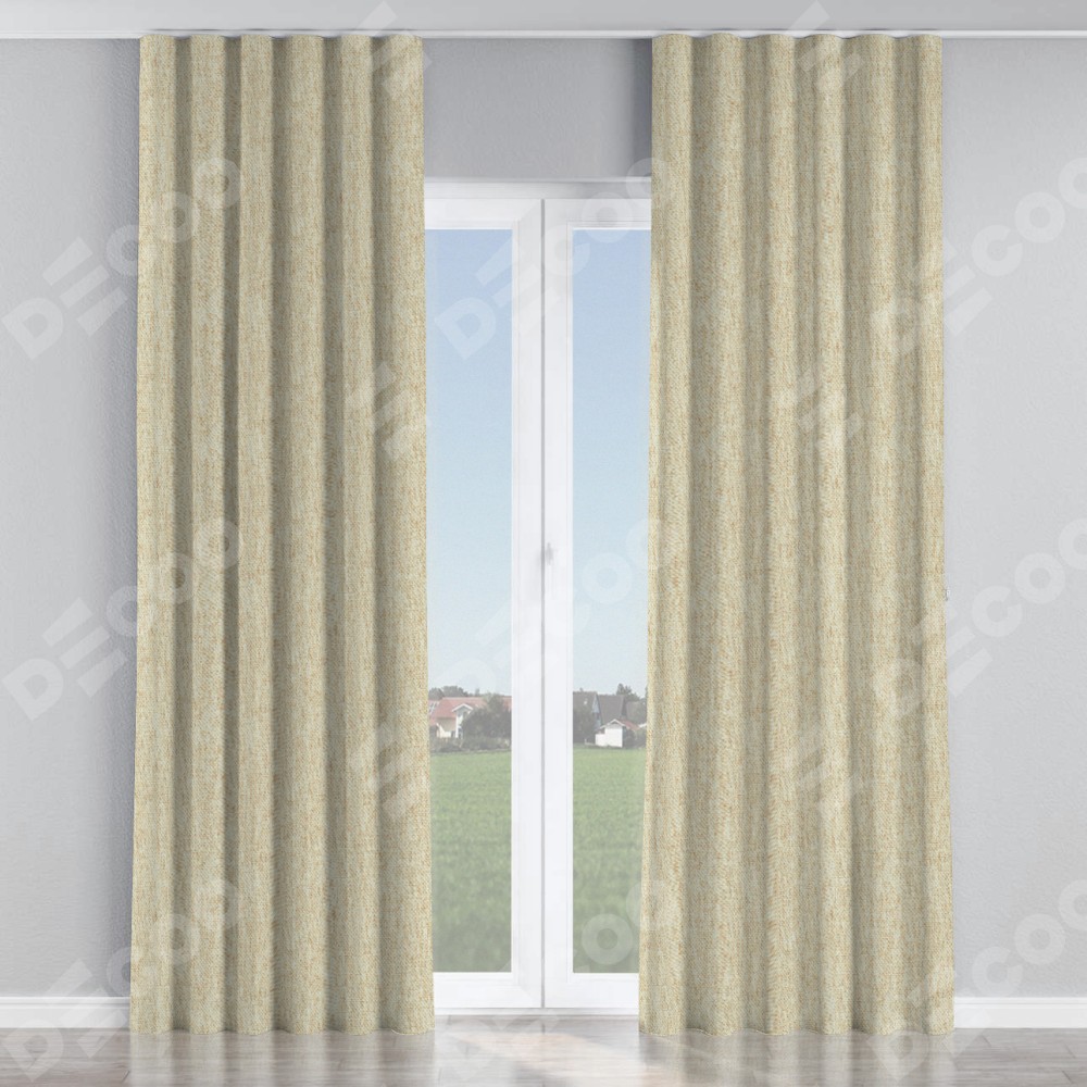 Комплект прямых штор, от производителя «Cortin», пошиты из ткани стиф димаут светло-бежевый, артикул ткани 18084. С изнаночной стороны в верхней части штор пристрачивается шторная лента с декоративными складками «Волна». Для создания элегантных складок прямые шторы шьются по стандарту с коэффициентом 1:2 (на 100 см. ширины проёма 200 см. ширины ткани).