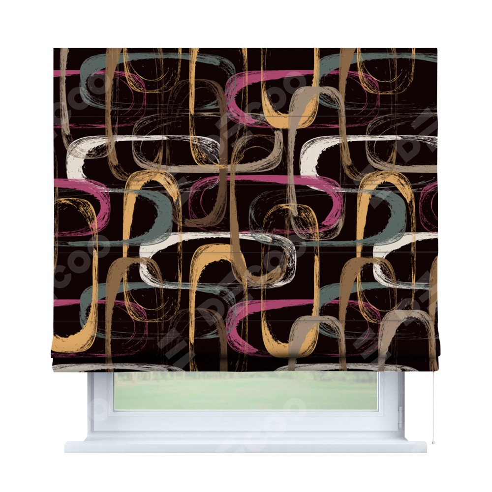Римская штора производителя «Cortin», используется для проёма, пошита из ткани блэкаут с нанесением сублимационной печати «Тёмная палитра». Имеет универсальный механизм и подходит для монтажа: на потолок, на стену и в нишу.