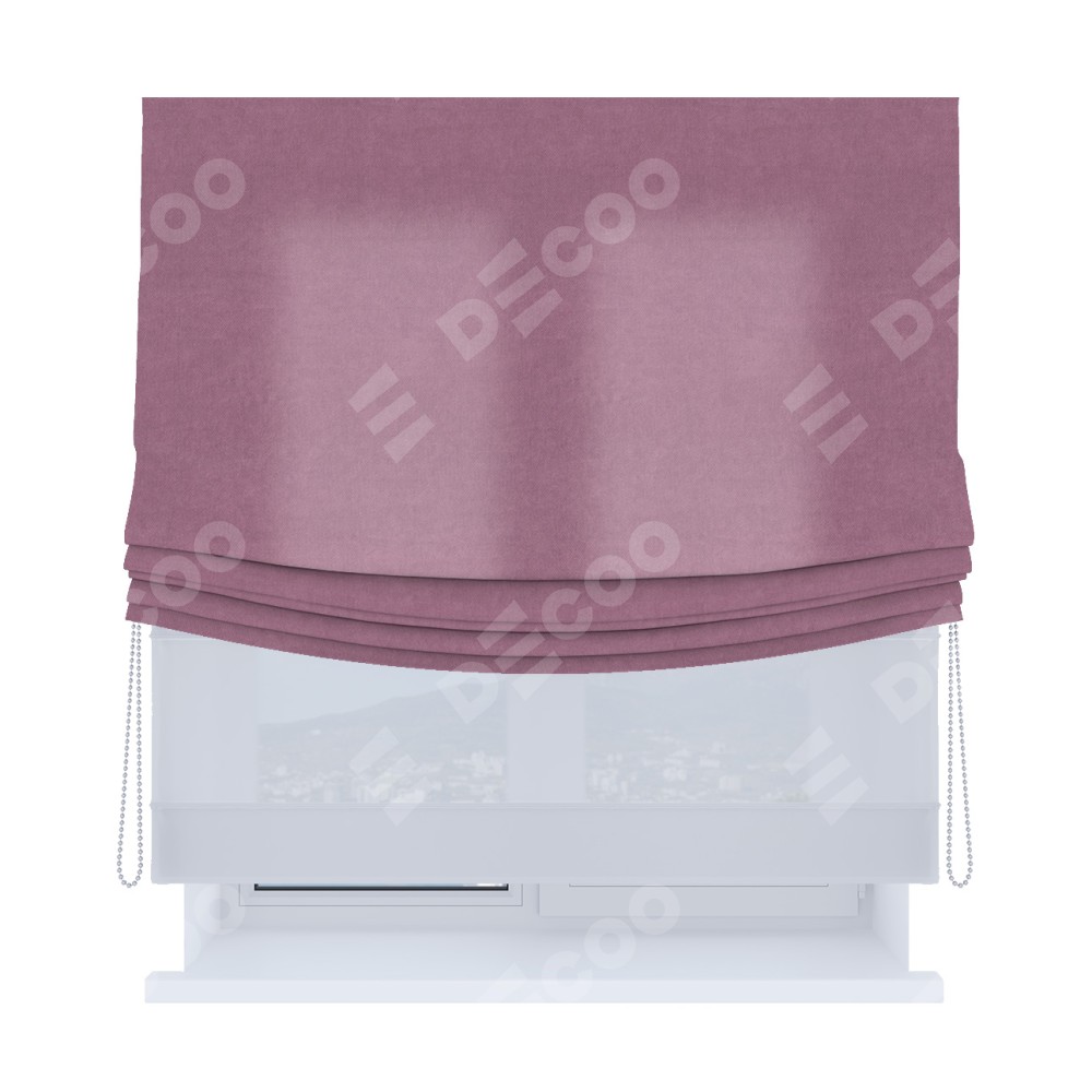 Римская штора день-ночь производителя «Cortin», используется для проёма, пошита из двух полотен, с лицевой стороны вельвет лиловый артикул 17752, вторая ткань тюль (по стандарту комплектуется тюль белого цвета артикул V-01). Имеет универсальный механизм и подходит для монтажа: на потолок, на стену и в нишу. Удобное управление каждой шторой отдельно.