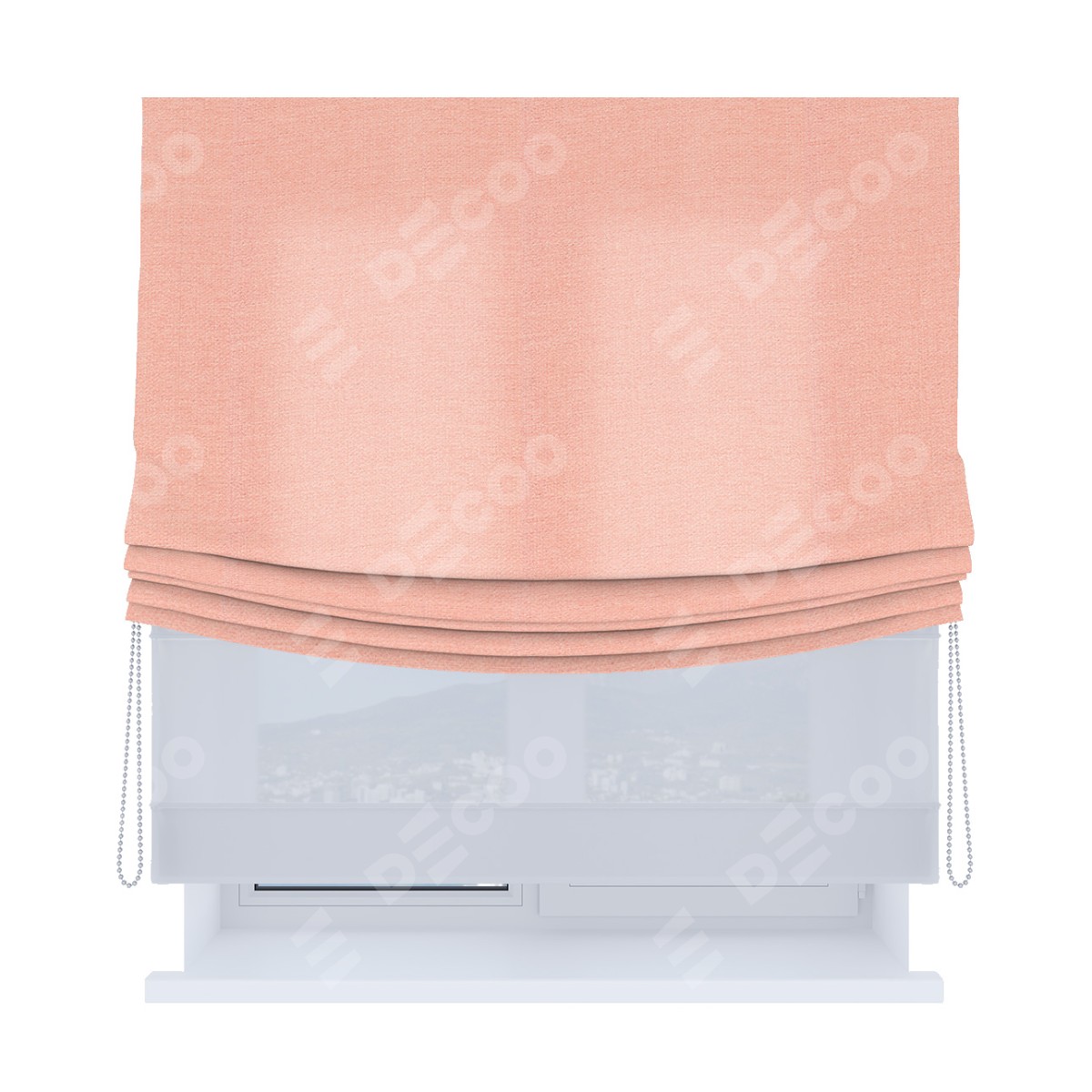 Римская штора день-ночь (двойная) от производителя «Cortin», используется для проёма. Пошита из двух полотен, основная ткань лён розовый артикул 00005, вторая ткань тюль (по стандарту используется тюль белого цвета артикул V-01). Имеет универсальный механизм и подходит для монтажа: на потолок, на стену и в нишу. Удобное управление каждой шторой отдельно.