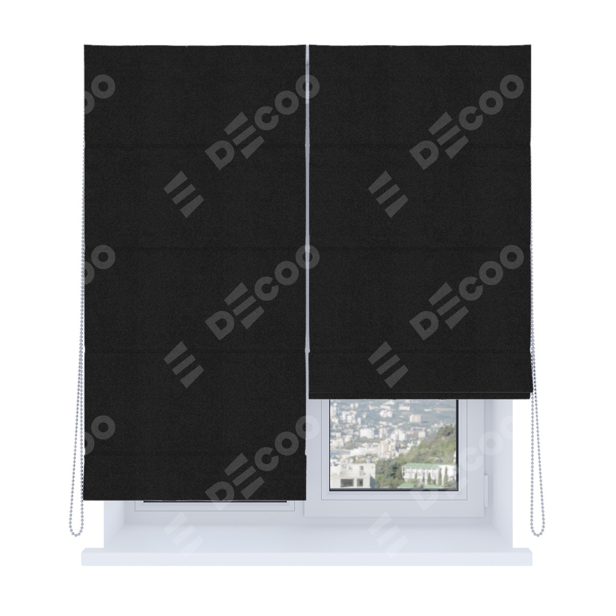 Римская штора производителя «Cortin», используется для проёма, пошита из ткани блэкаут однотонный черный, артикул ткани 79904. Имеет универсальный механизм и подходит для монтажа: на потолок, на стену и в нишу. Удобное управление каждой шторой отдельно.