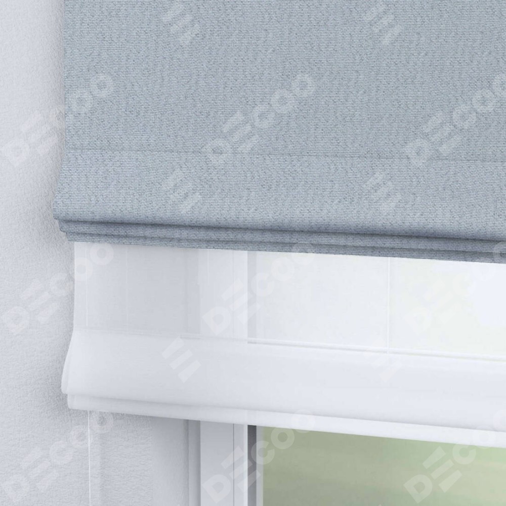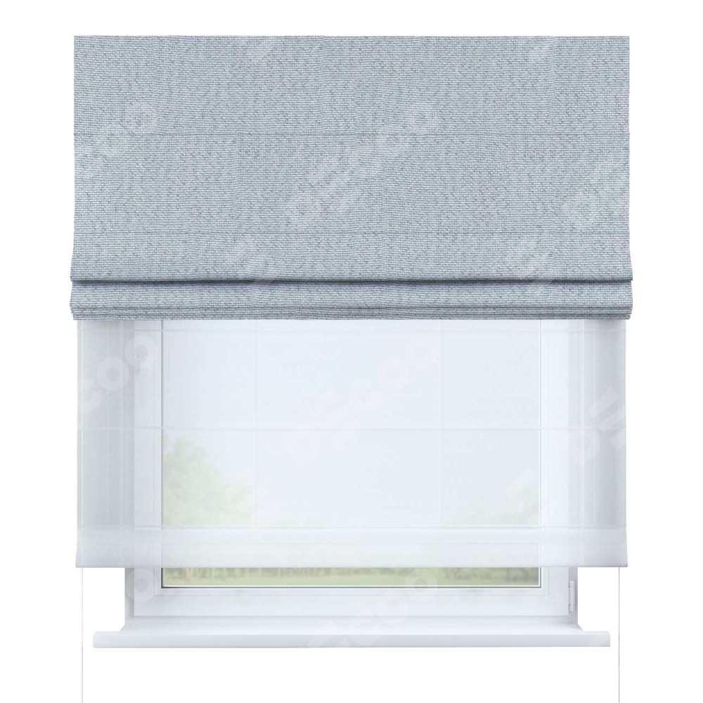 Римская штора день-ночь производителя «Cortin», используется для проёма, пошита из двух полотен, с лицевой стороны лён димаут серый артикул F3, вторая ткань тюль (по стандарту комплектуется тюль белого цвета артикул V-01). Имеет универсальный механизм и подходит для монтажа: на потолок, на стену и в нишу.