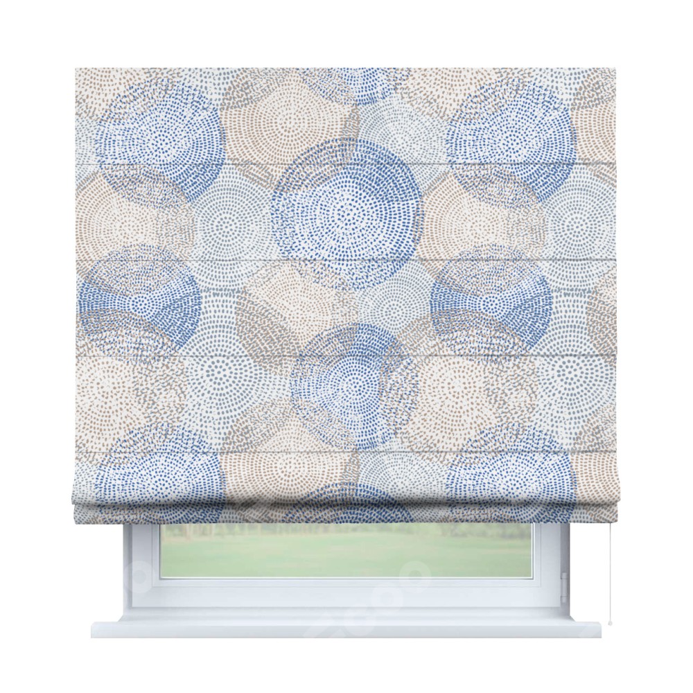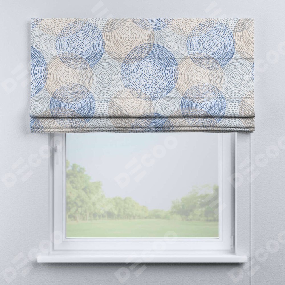 Римская штора производителя «Cortin», используется для проёма, пошита из ткани блэкаут с нанесением сублимационной печати «Абстрактные круги». Имеет универсальный механизм и подходит для монтажа: на потолок, на стену и в нишу.