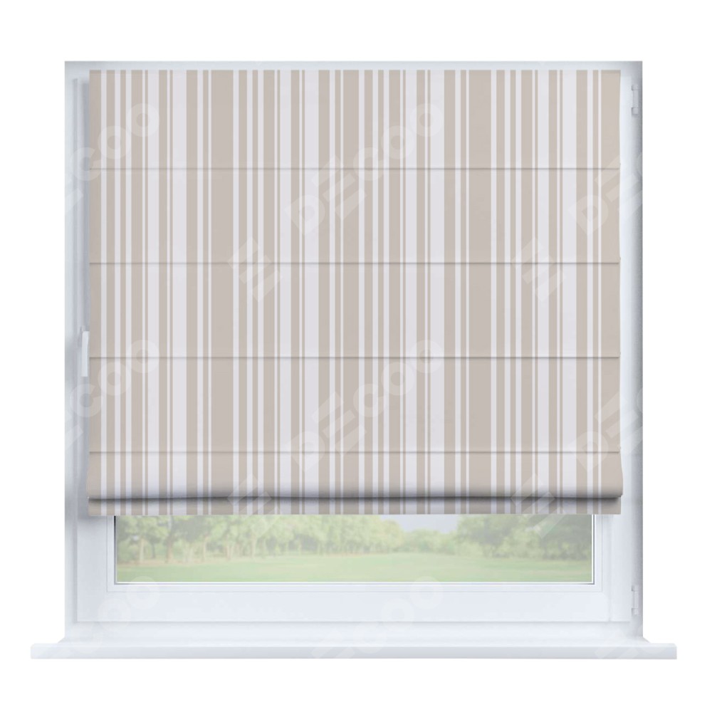 Римская штора производителя «Cortin», устанавливается на створку окна, пошита из ткани блэкаут с нанесением сублимационной печати «Бежевые вертикальные полоски». Штора шьётся по индивидуальным размерам, для данного типа римской шторы возможная ширина от 35 до 150 см., высота до 250 см.
