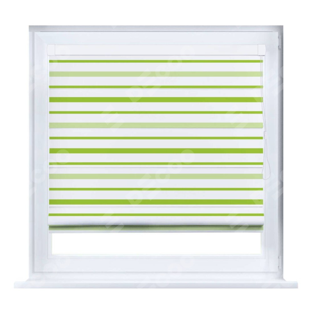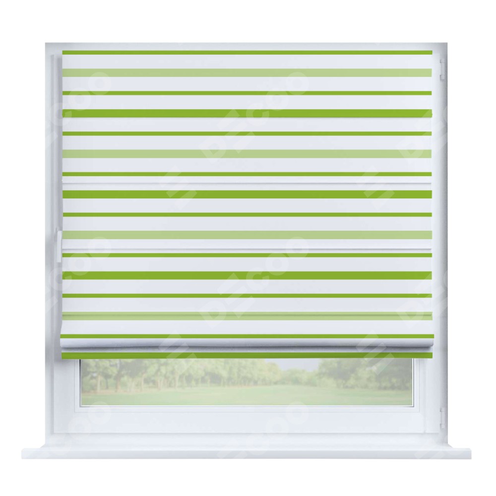 Римская штора производителя «Cortin», устанавливается на створку окна, пошита из ткани блэкаут с нанесением сублимационной печати «Зелёные горизонтальные полоски». Штора шьётся по индивидуальным размерам, для данного типа римской шторы возможная ширина от 35 до 150 см., высота до 250 см.