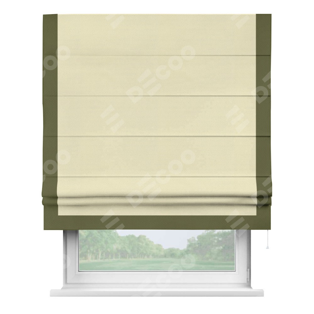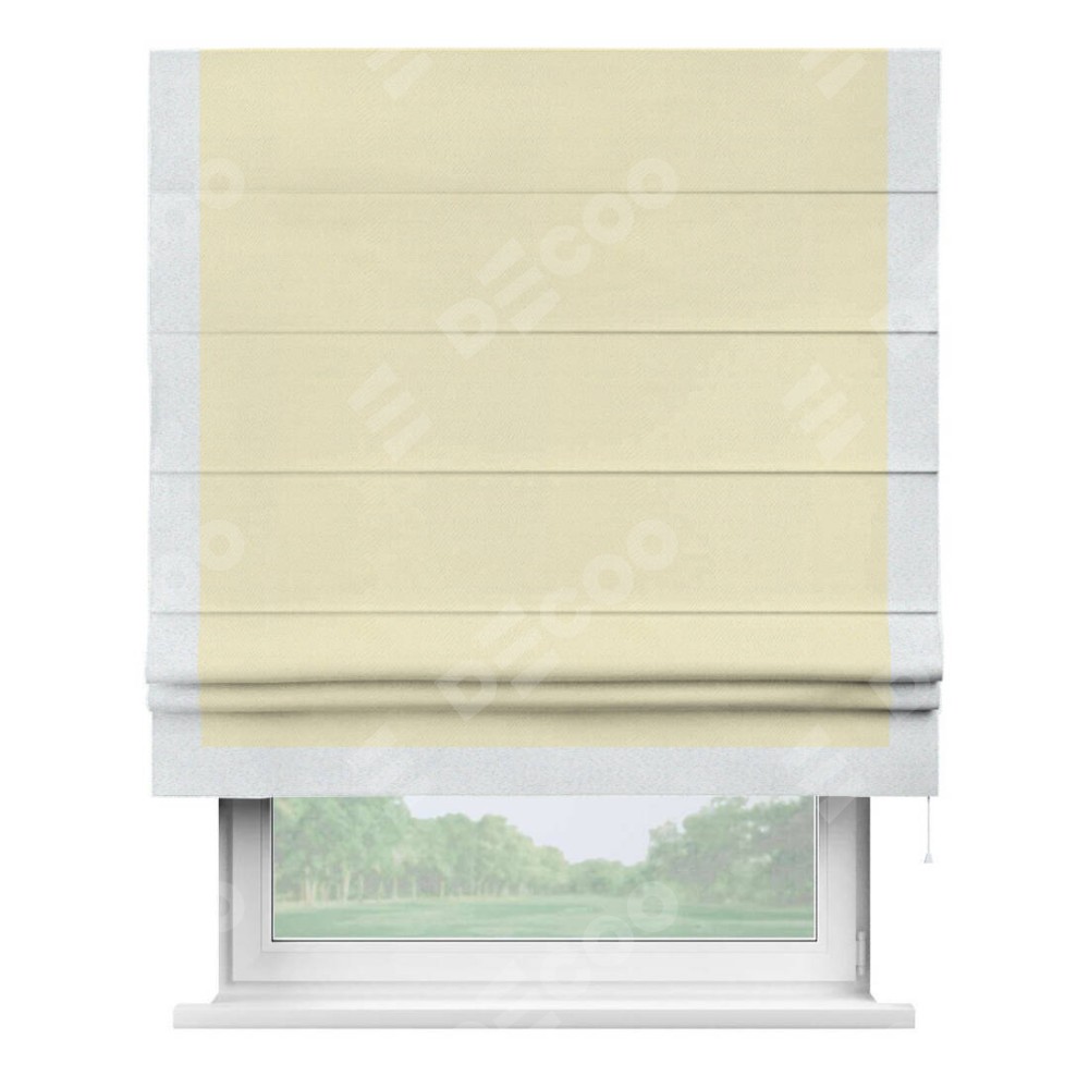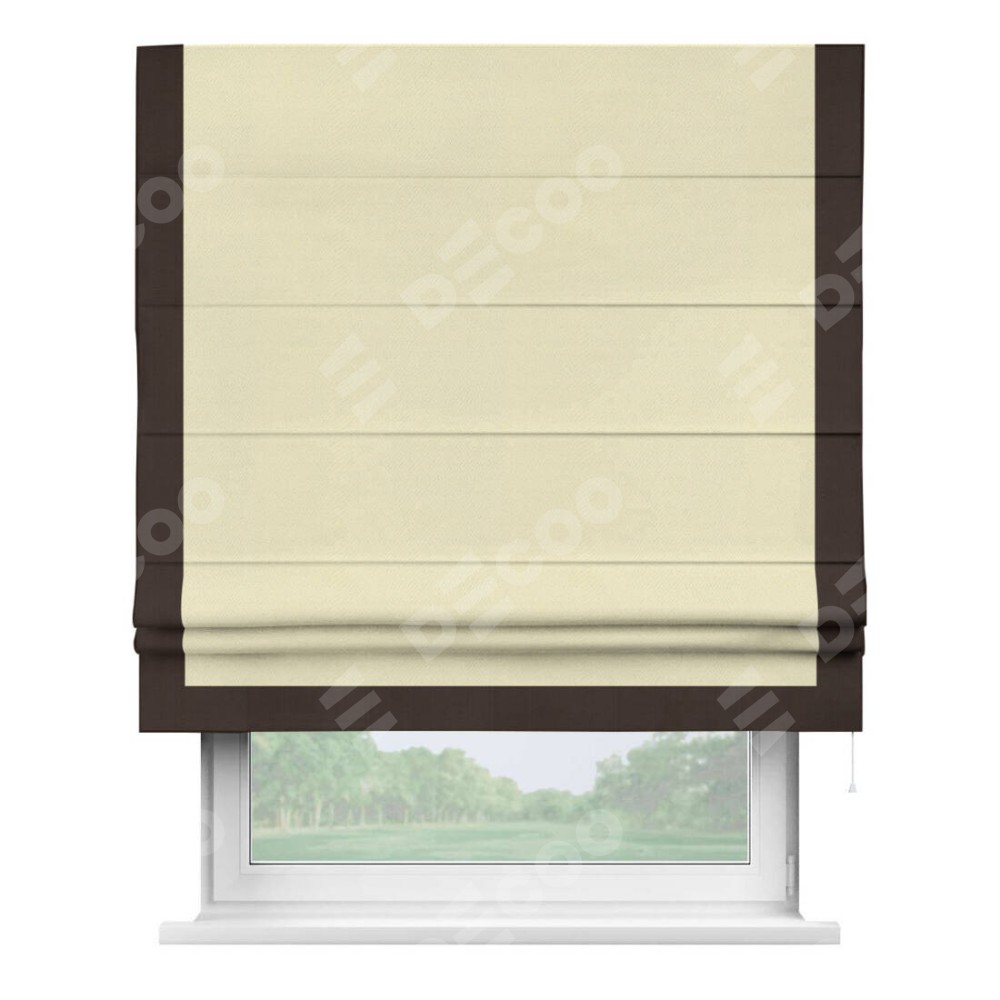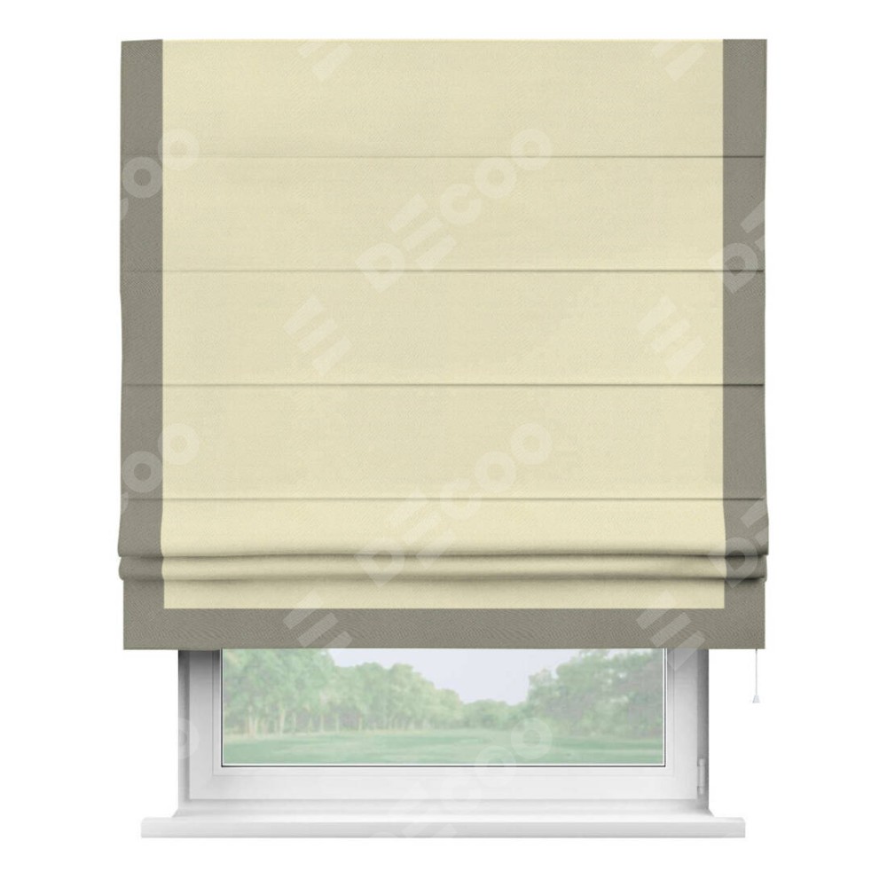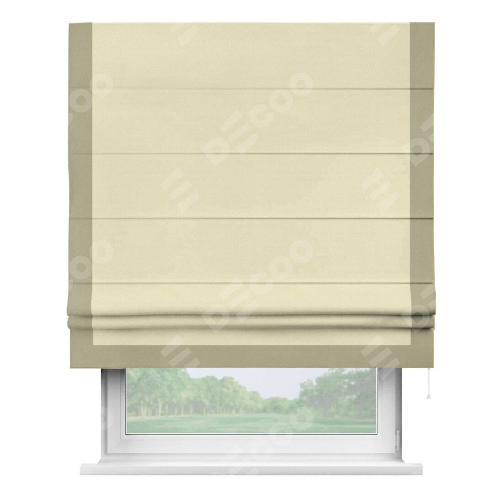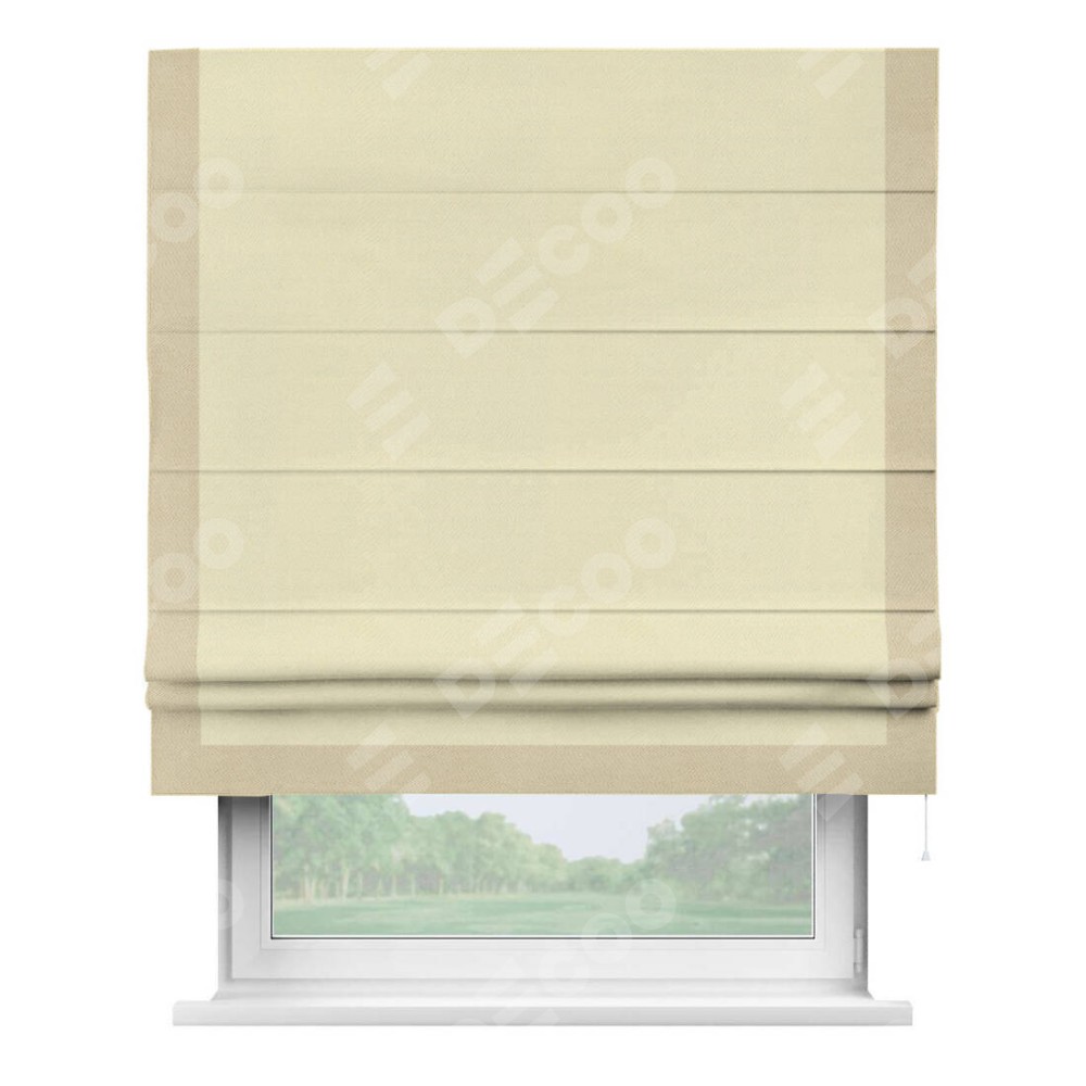 Римская штора производителя «Cortin», используется для проёма, пошита из ткани блэкаут однотонный бежевый, артикул ткани 88283. Отделка шторы кантом «Виктория», ткань для канта используется из блэкаута однотонного разной расцветки на выбор. Имеет универсальный механизм и подходит для монтажа: на потолок, на стену и в нишу.