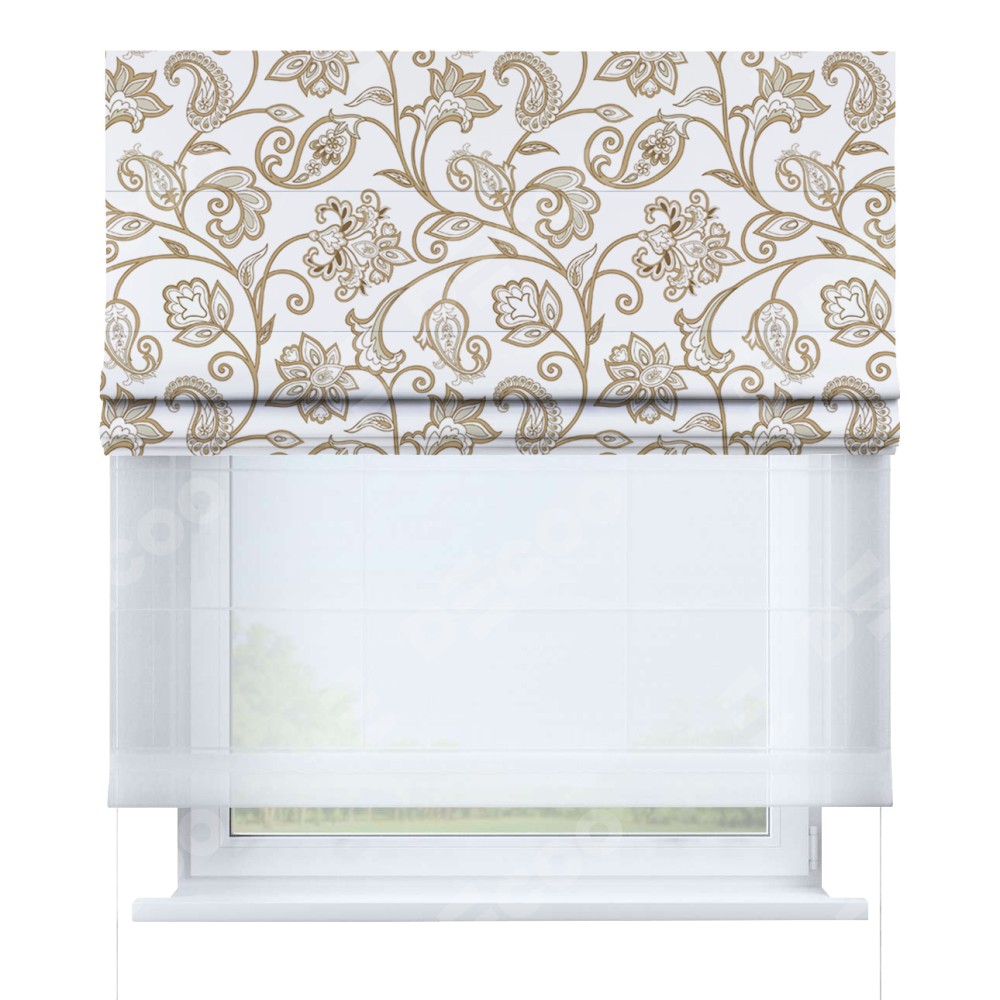 Римская штора день-ночь производителя «Cortin», используется для проёма, пошита из двух полотен, с лицевой блэкаут с нанесением сублимационной печати «Королевская роскошь», вторая ткань тюль (по стандарту комплектуется тюль белого цвета артикул V-01). Имеет универсальный механизм и подходит для монтажа: на потолок, на стену и в нишу.