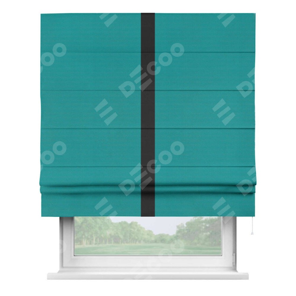 Римская штора производителя «Cortin», используется для проёма, пошита из ткани блэкаут однотонный бирюзовый, артикул ткани 88297. Отделка шторы кантом «Хайвей», ткань для канта используется из блэкаута однотонного разной расцветки на выбор. Имеет универсальный механизм и подходит для монтажа: на потолок, на стену и в нишу.