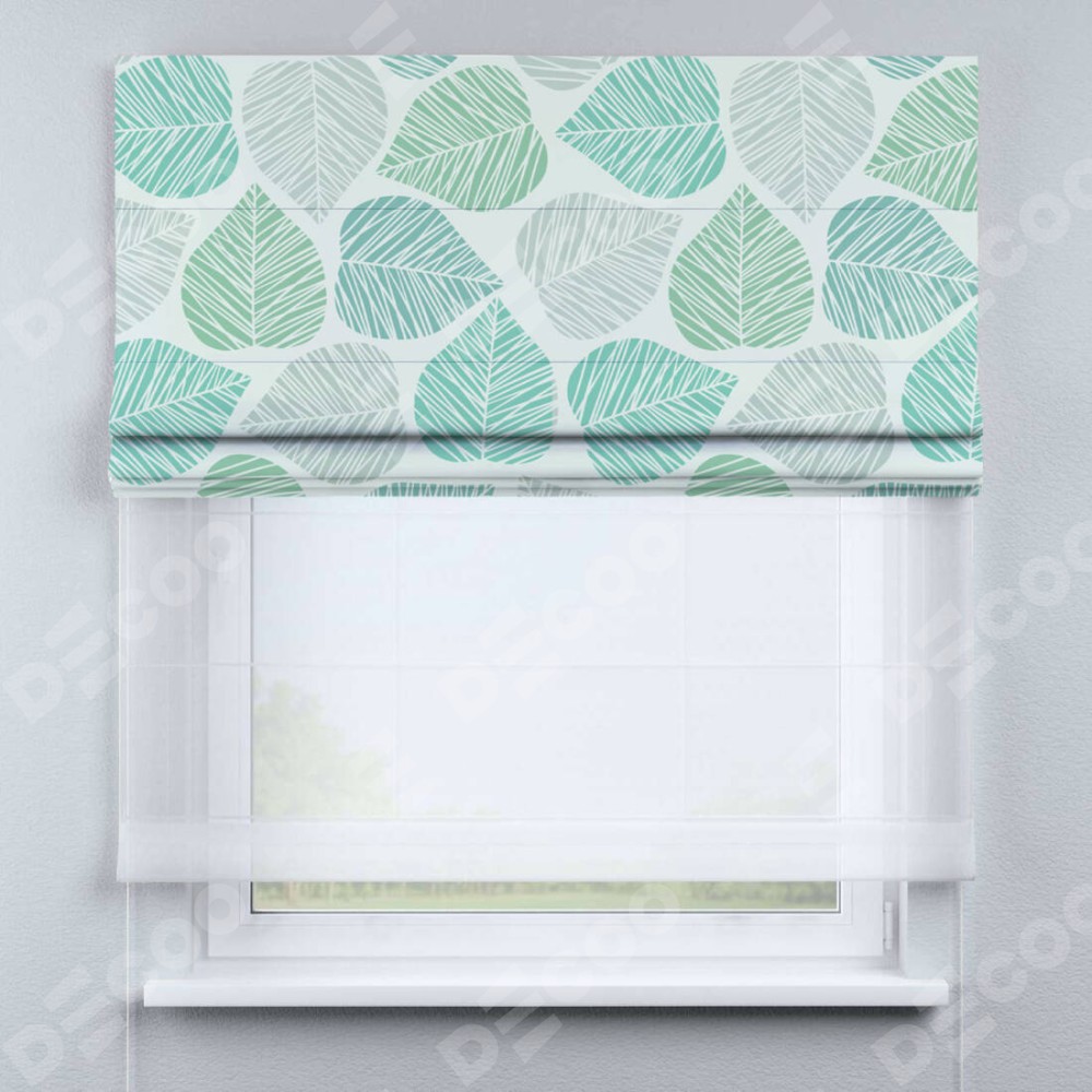 Римская штора день-ночь производителя «Cortin», используется для проёма, пошита из двух полотен, с лицевой блэкаут с нанесением сублимационной печати «Весенняя листва», вторая ткань тюль (по стандарту комплектуется тюль белого цвета артикул V-01). Имеет универсальный механизм и подходит для монтажа: на потолок, на стену и в нишу.