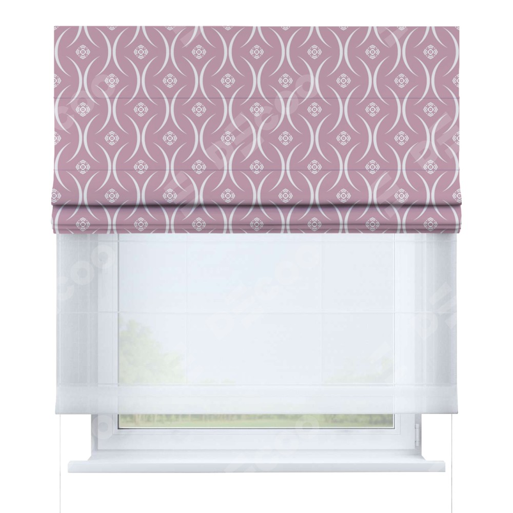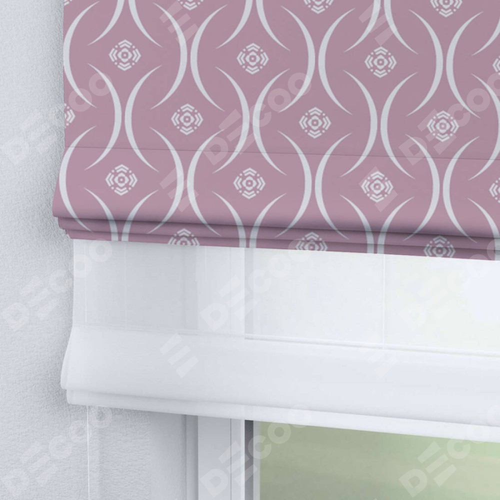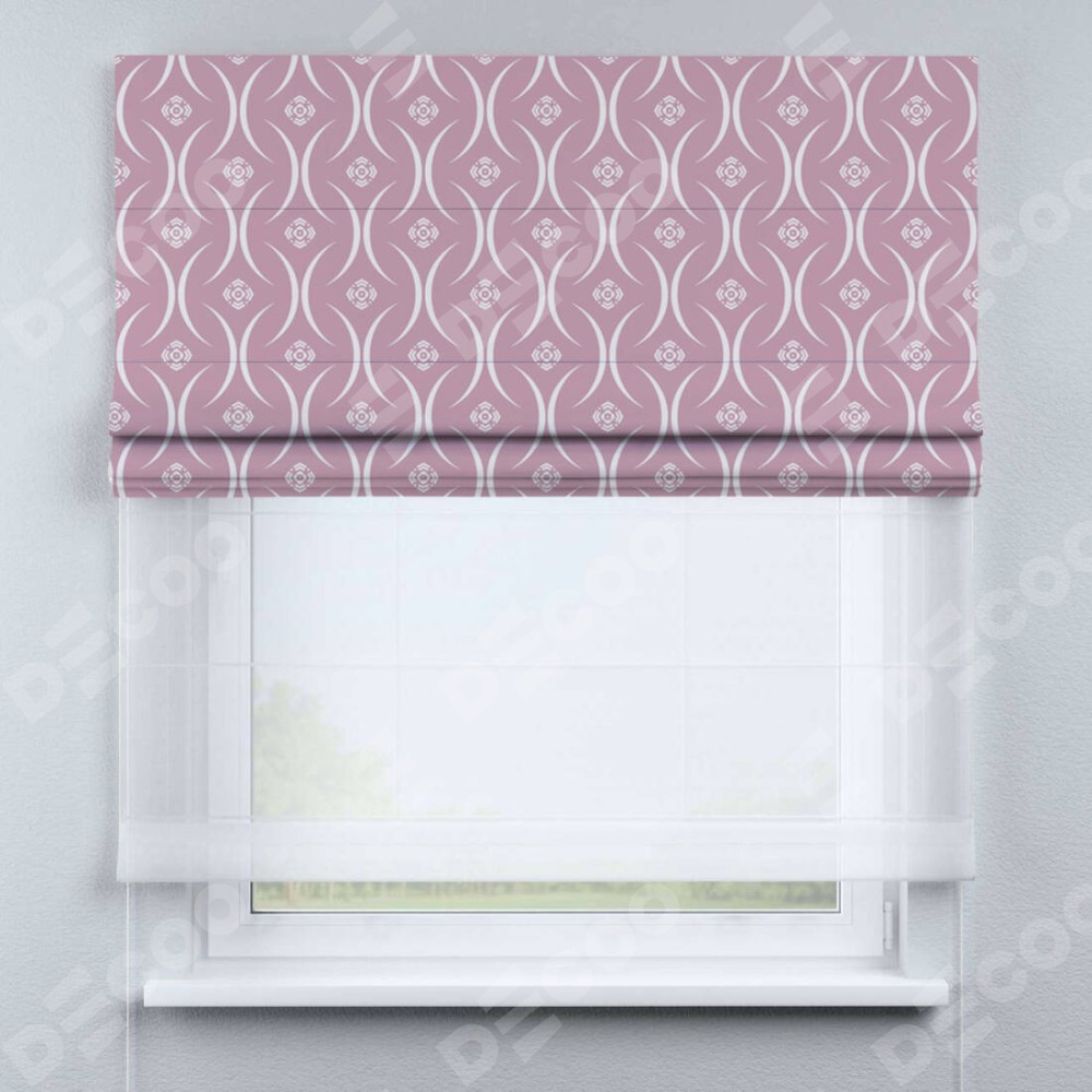 Римская штора день-ночь производителя «Cortin», используется для проёма, пошита из двух полотен, с лицевой блэкаут с нанесением сублимационной печати «Воздушный узор розовый», вторая ткань тюль (по стандарту комплектуется тюль белого цвета артикул V-01). Имеет универсальный механизм и подходит для монтажа: на потолок, на стену и в нишу.