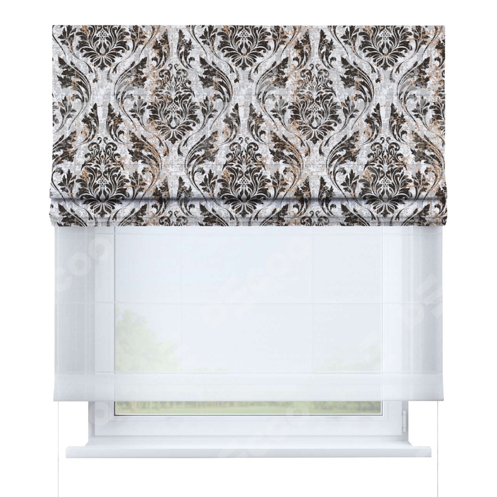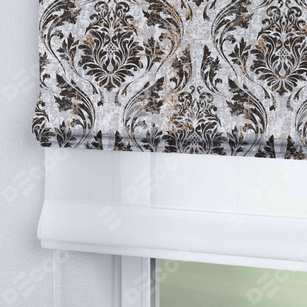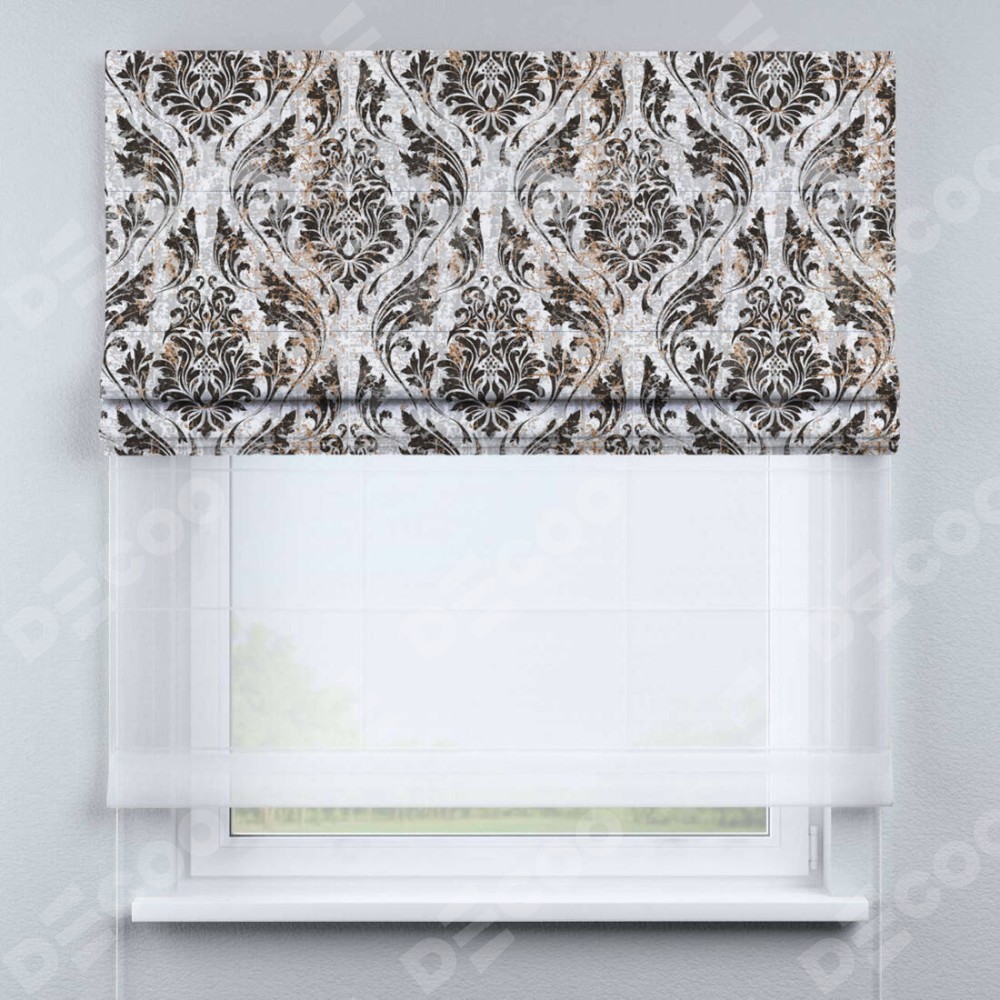 Римская штора день-ночь производителя «Cortin», используется для проёма, пошита из двух полотен, с лицевой блэкаут с нанесением сублимационной печати «Дамаск тёмный», вторая ткань тюль (по стандарту комплектуется тюль белого цвета артикул V-01). Имеет универсальный механизм и подходит для монтажа: на потолок, на стену и в нишу.