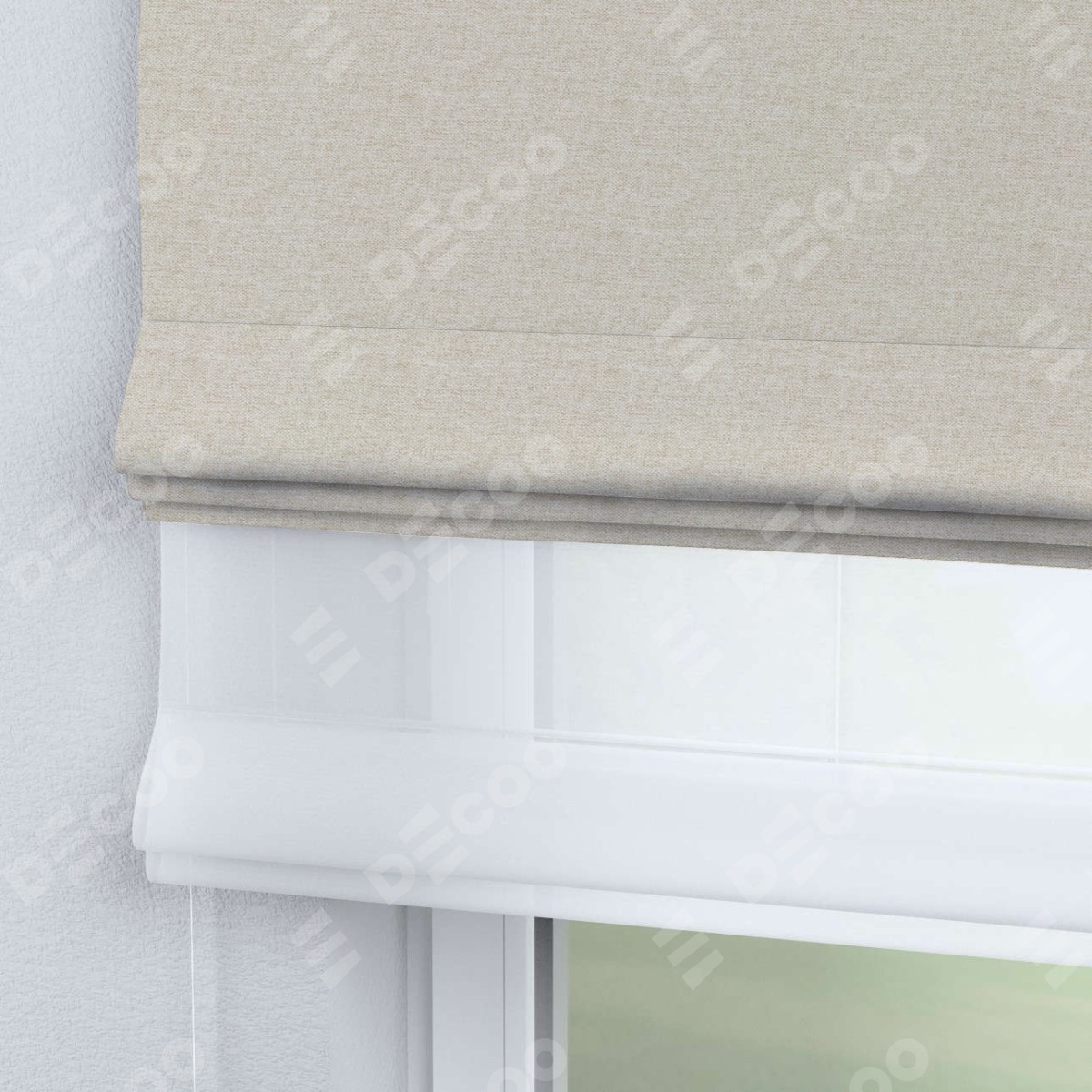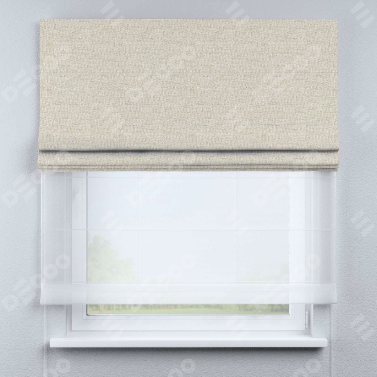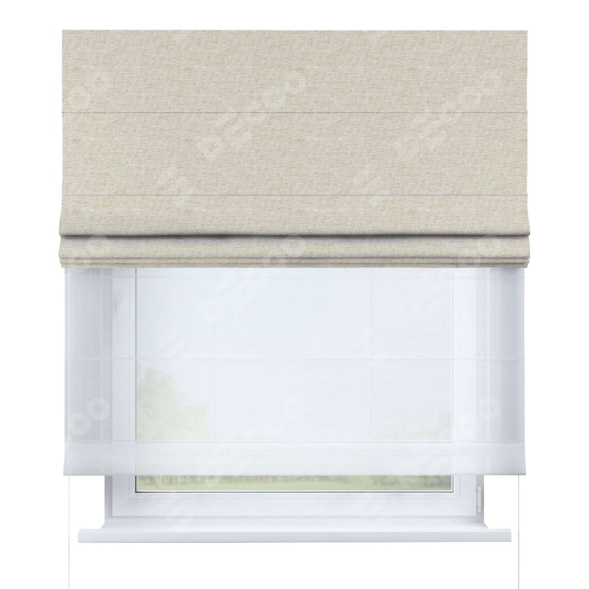 Римская штора день-ночь производителя «Cortin», используется для проёма, пошита из двух полотен, с лицевой стороны стиф димаут молочный артикул 18082, вторая ткань тюль (по стандарту комплектуется тюль белого цвета артикул V-01). Имеет универсальный механизм и подходит для монтажа: на потолок, на стену и в нишу.