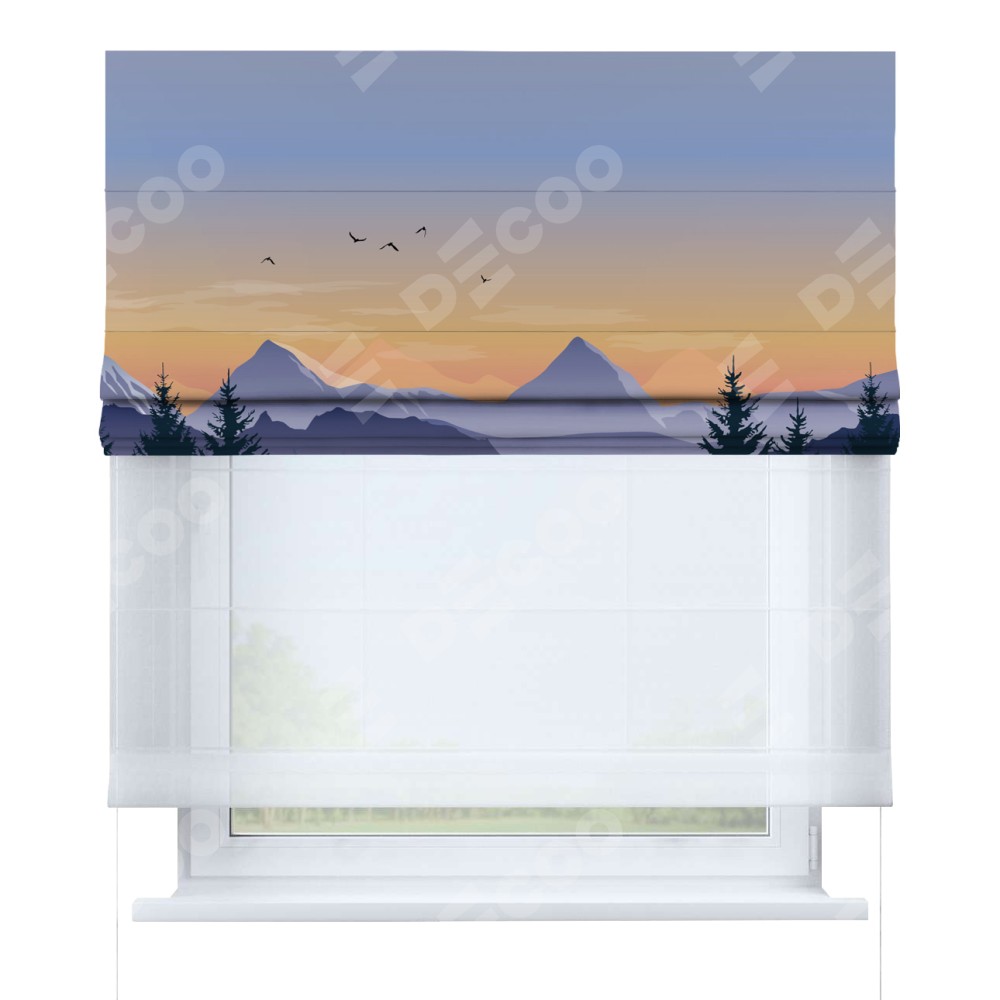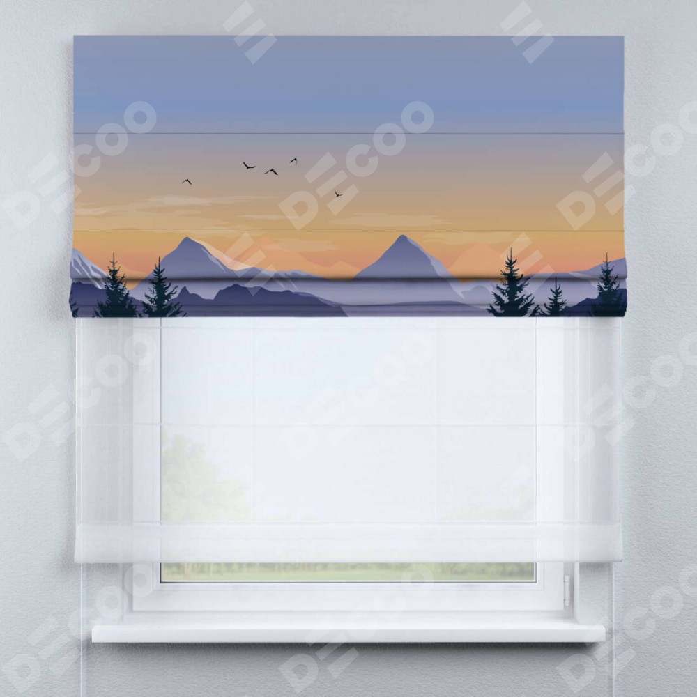 Римская штора день-ночь производителя «Cortin», используется для проёма, пошита из двух полотен, с лицевой блэкаут с нанесением сублимационной печати «Закат в горах», вторая ткань тюль (по стандарту комплектуется тюль белого цвета артикул V-01). Имеет универсальный механизм и подходит для монтажа: на потолок, на стену и в нишу.