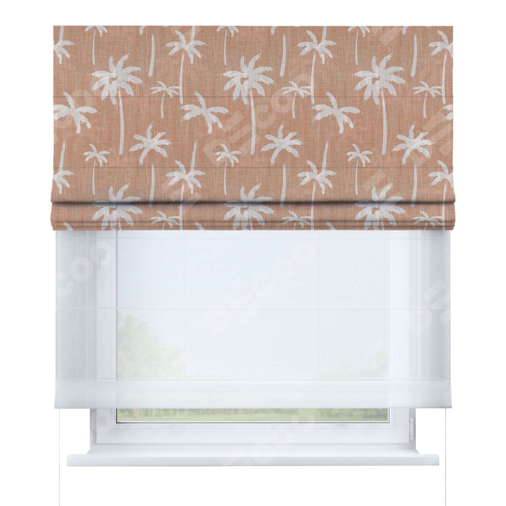 Римская штора день-ночь производителя «Cortin», используется для проёма, пошита из двух полотен, с лицевой блэкаут с нанесением сублимационной печати «Пальмы на закате», вторая ткань тюль (по стандарту комплектуется тюль белого цвета артикул V-01). Имеет универсальный механизм и подходит для монтажа: на потолок, на стену и в нишу.