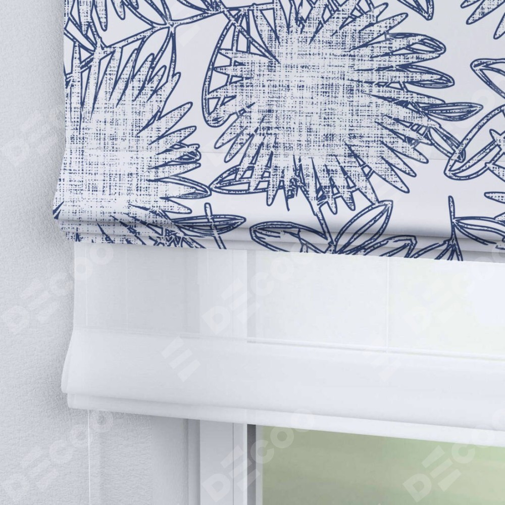Римская штора день-ночь производителя «Cortin», используется для проёма, пошита из двух полотен, с лицевой блэкаут с нанесением сублимационной печати «Синий букет», вторая ткань тюль (по стандарту комплектуется тюль белого цвета артикул V-01). Имеет универсальный механизм и подходит для монтажа: на потолок, на стену и в нишу.