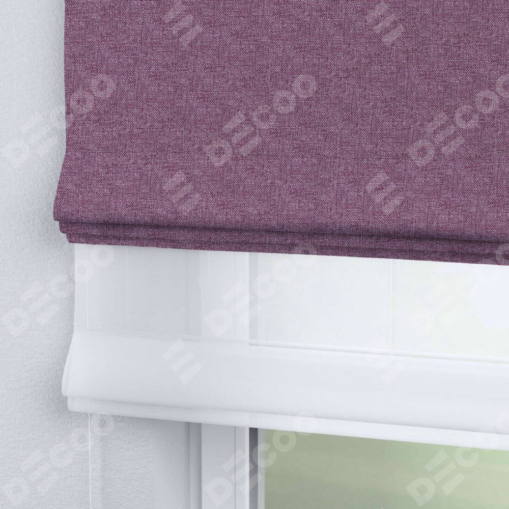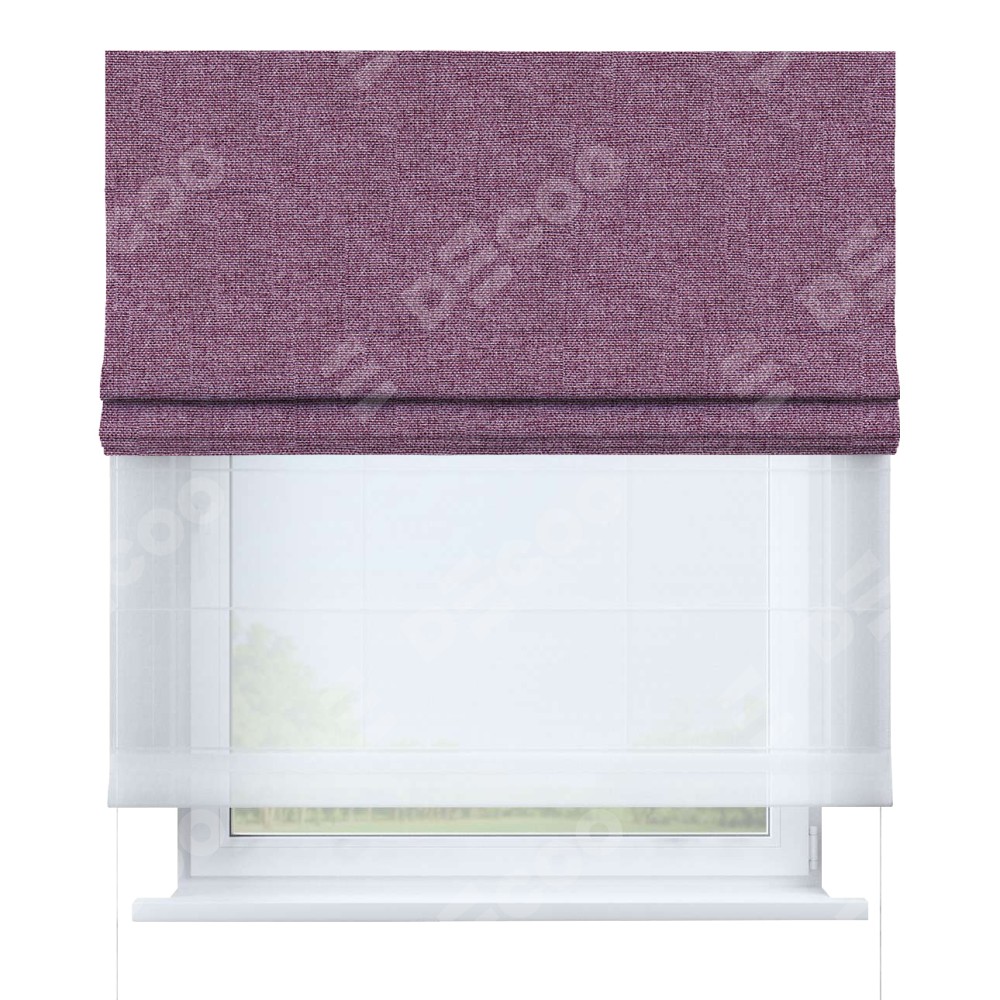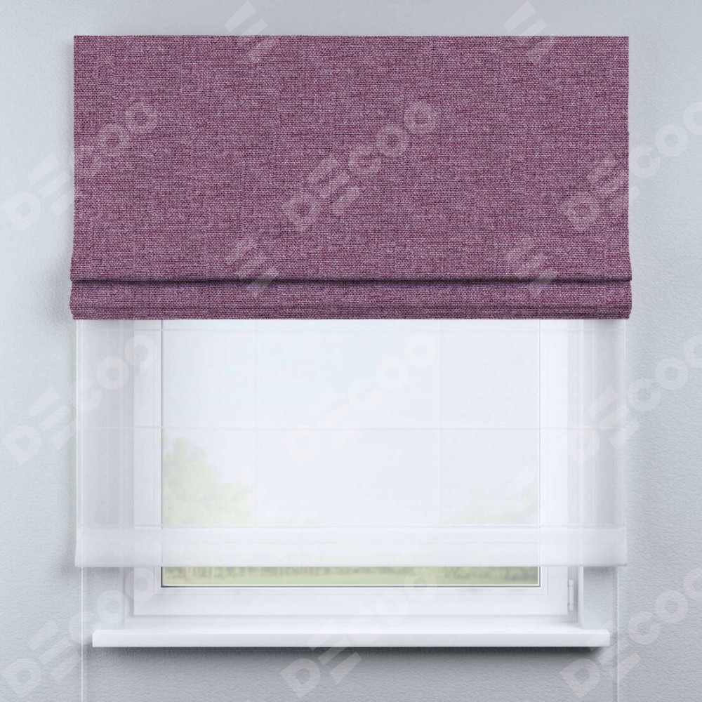 Римская штора день-ночь производителя «Cortin», используется для проёма, пошита из двух полотен, с лицевой стороны лён кашемир сиреневый артикул 21620, вторая ткань тюль (по стандарту комплектуется тюль белого цвета артикул V-01). Имеет универсальный механизм и подходит для монтажа: на потолок, на стену и в нишу.