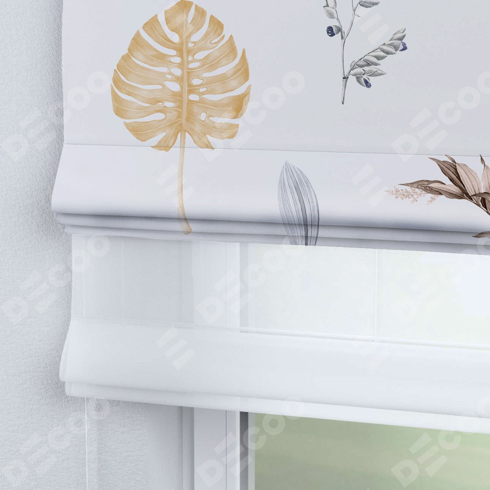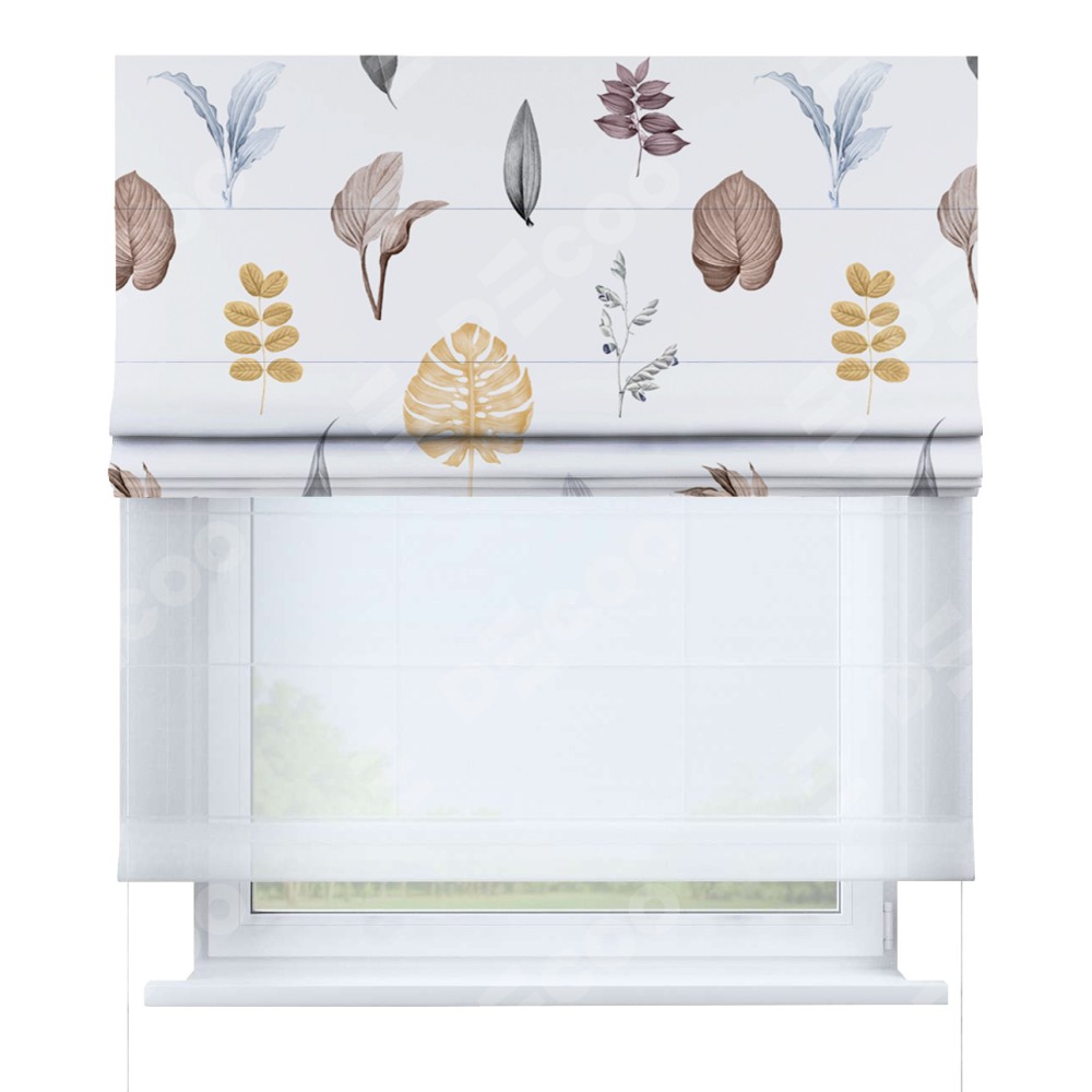 Римская штора день-ночь производителя «Cortin», используется для проёма, пошита из двух полотен, с лицевой блэкаут с нанесением сублимационной печати «Осенний коллаж», вторая ткань тюль (по стандарту комплектуется тюль белого цвета артикул V-01). Имеет универсальный механизм и подходит для монтажа: на потолок, на стену и в нишу.