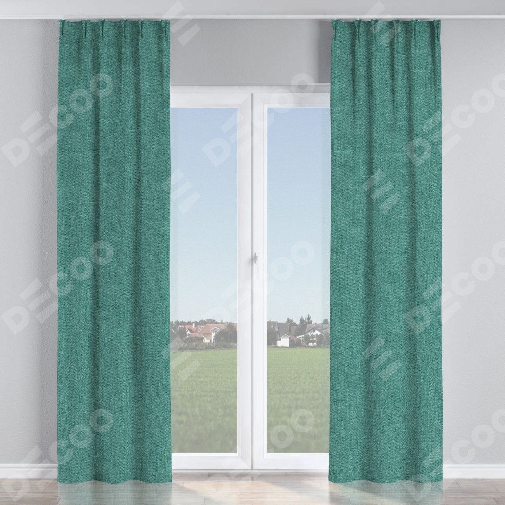 Комплект прямых штор, от производителя «Cortin», пошиты из ткани лён кашемир бирюзовый, артикул ткани 17214. С изнаночной стороны в верхней части штор пристрачивается шторная лента с декоративными складками «Кустик». Для создания элегантных складок прямые шторы шьются по стандарту с коэффициентом 1:2 (на 100 см. ширины проёма 200 см. ширины ткани).