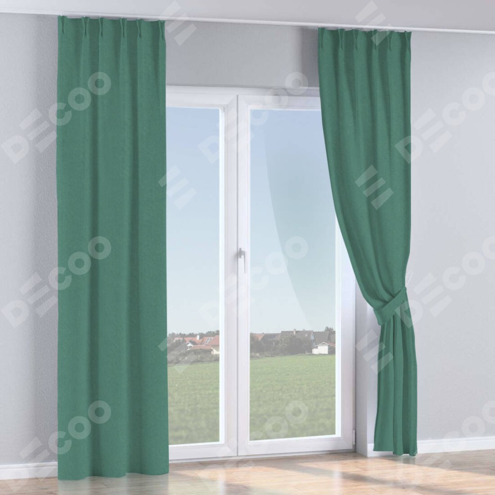 Комплект прямых штор, от производителя «Cortin», пошиты из ткани лён блэкаут бирюзовый, артикул ткани 69517. С изнаночной стороны в верхней части штор пристрачивается шторная лента с декоративными складками «Кустик». Для создания элегантных складок прямые шторы шьются по стандарту с коэффициентом 1:2 (на 100 см. ширины проёма 200 см. ширины ткани).