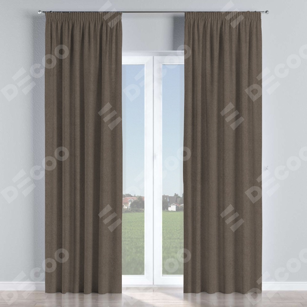 Комплект прямых штор, от производителя «Cortin», пошиты из ткани лён блэкаут коричневый, артикул ткани 69383. С изнаночной стороны в верхней части штор пристрачивается шторная лента с декоративными складками «Карандаш». Для создания элегантных складок прямые шторы шьются по стандарту с коэффициентом 1:2 (на 100 см. ширины проёма 200 см. ширины ткани).