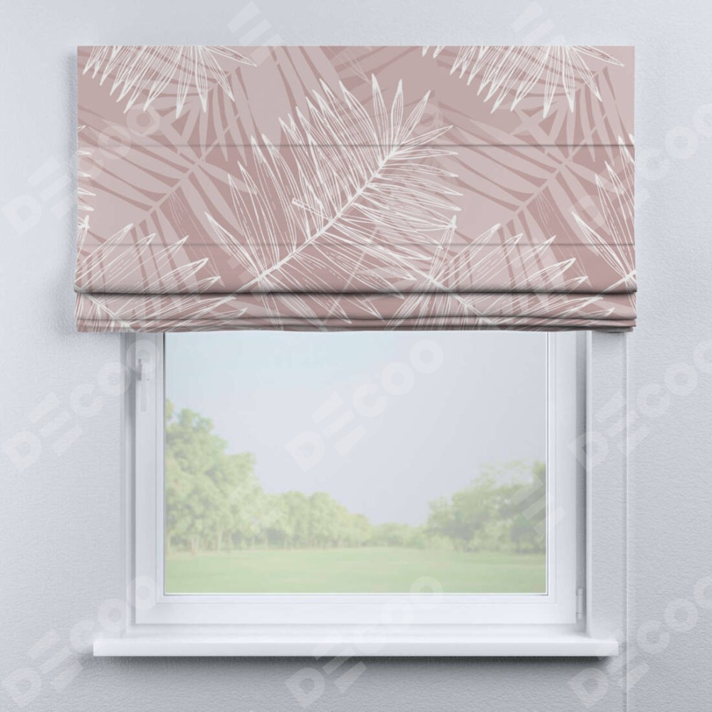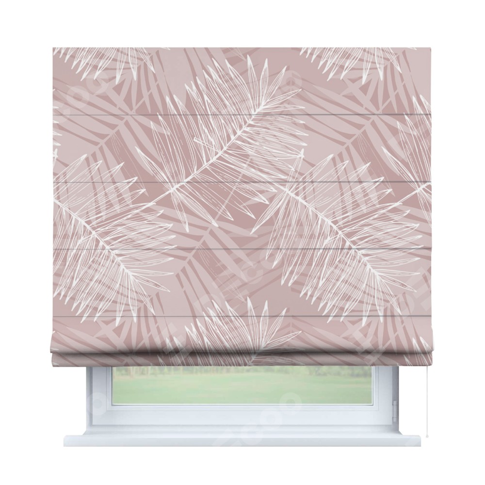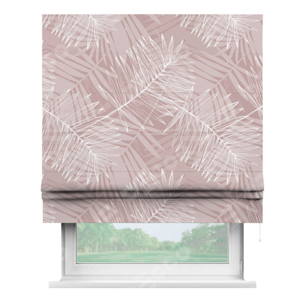 Римская штора производителя «Cortin», используется для проёма, пошита из ткани блэкаут с нанесением сублимационной печати «Бежевые тропики». Имеет универсальный механизм и подходит для монтажа: на потолок, на стену и в нишу.