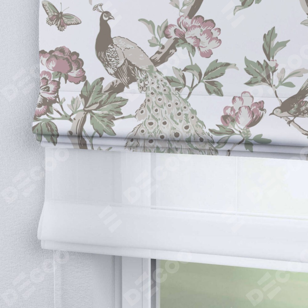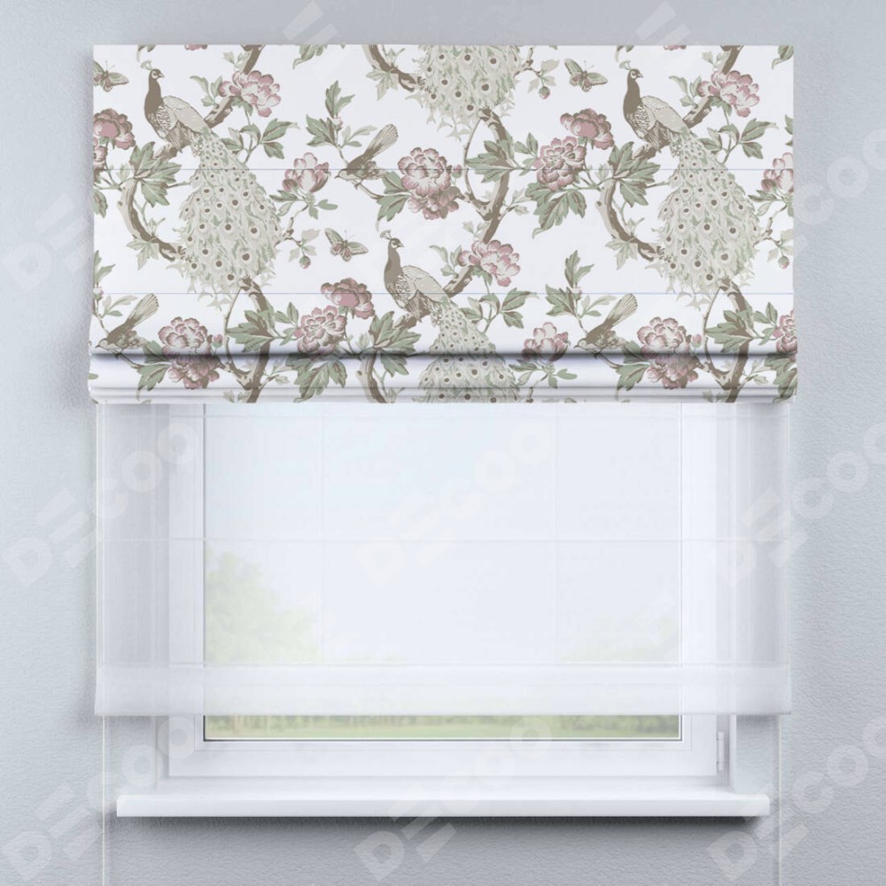 Римская штора день-ночь производителя «Cortin», используется для проёма, пошита из двух полотен, с лицевой блэкаут с нанесением сублимационной печати «Гордые павлины», вторая ткань тюль (по стандарту комплектуется тюль белого цвета артикул V-01). Имеет универсальный механизм и подходит для монтажа: на потолок, на стену и в нишу.