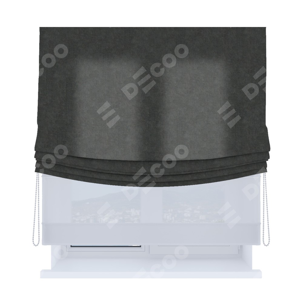 Римская штора день-ночь производителя «Cortin», используется для проёма, пошита из двух полотен, с лицевой стороны вельвет тёмно-серый артикул 33811, вторая ткань тюль (по стандарту комплектуется тюль белого цвета артикул V-01). Имеет универсальный механизм и подходит для монтажа: на потолок, на стену и в нишу. Удобное управление каждой шторой отдельно.