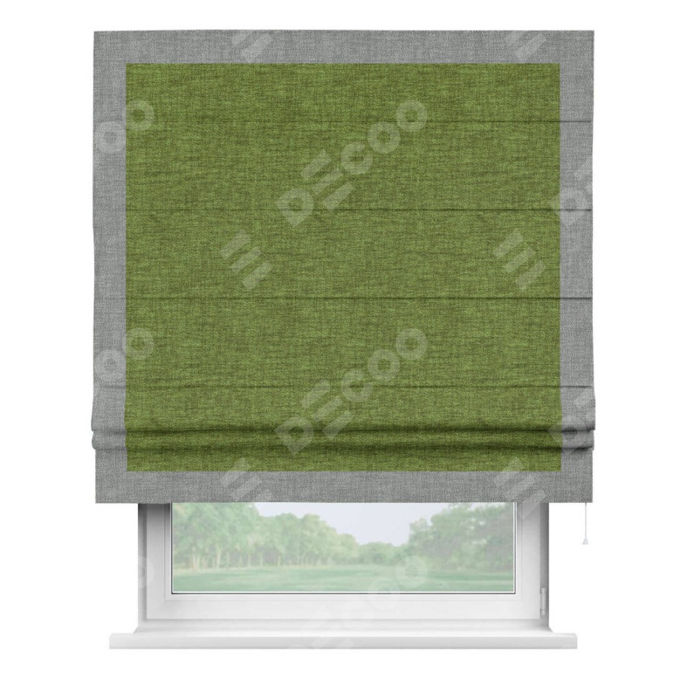 Римская штора производителя «Cortin», используется для проёма, пошита из ткани рогожка димаут салатовый, артикул 80423. Отделка шторы кантом «Чесс», ткань для канта используется из рогожки димаут разной расцветки на выбор. Имеет универсальный механизм и подходит для монтажа: на потолок, на стену и в нишу.
