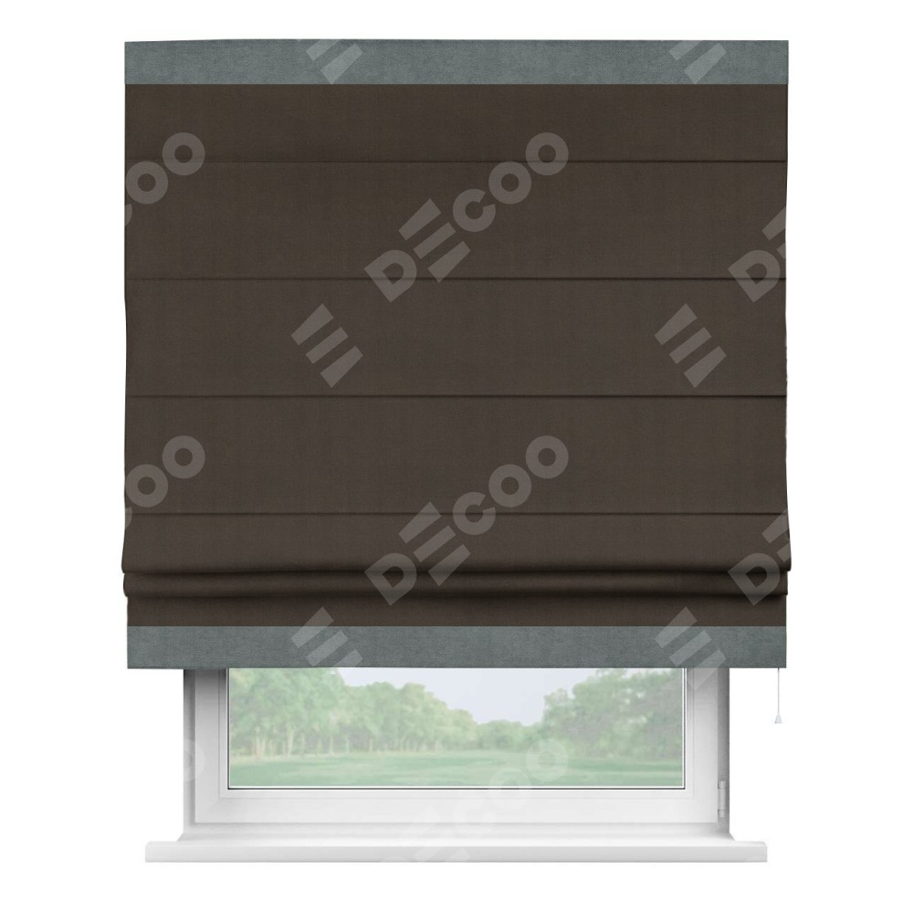 Римская штора производителя «Cortin», используется для проёма, пошита из ткани вельвет тёмно-коричневый, артикул ткани 30991. Отделка шторы кантом «Горизонт», ткань для канта используется из вельвета разной расцветки на выбор. Имеет универсальный механизм и подходит для монтажа: на потолок, на стену и в нишу.