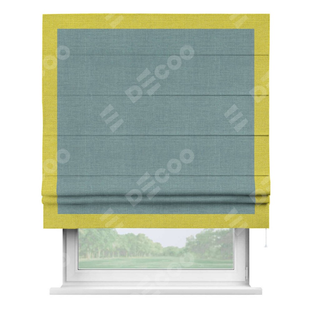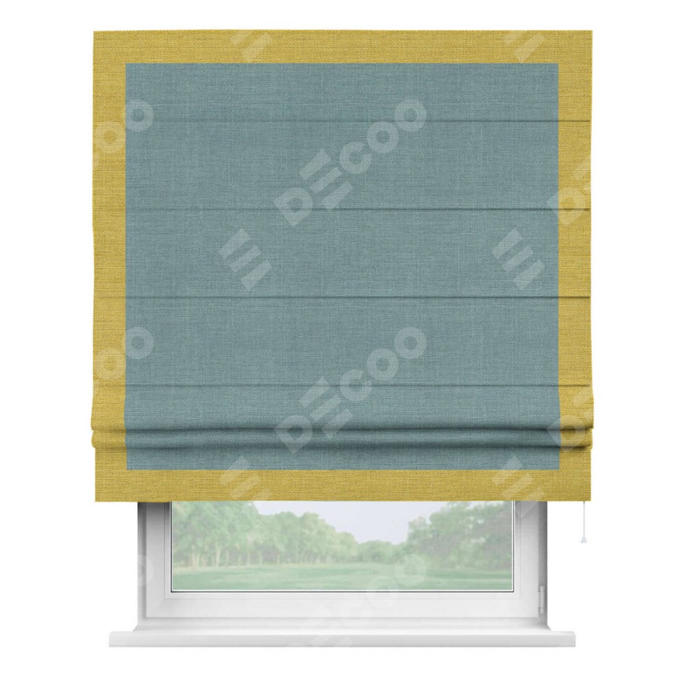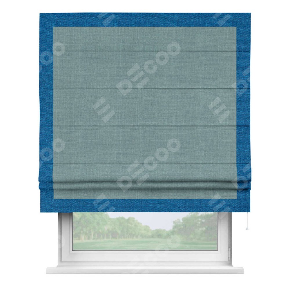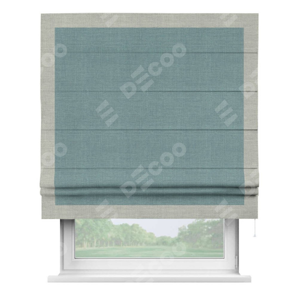 Римская штора производителя «Cortin», используется для проёма, пошита из ткани лён голубой, артикул 74736. Отделка шторы кантом «Чесс», ткань для канта используется из льна разной расцветки на выбор. Имеет универсальный механизм и подходит для монтажа: на потолок, на стену и в нишу.