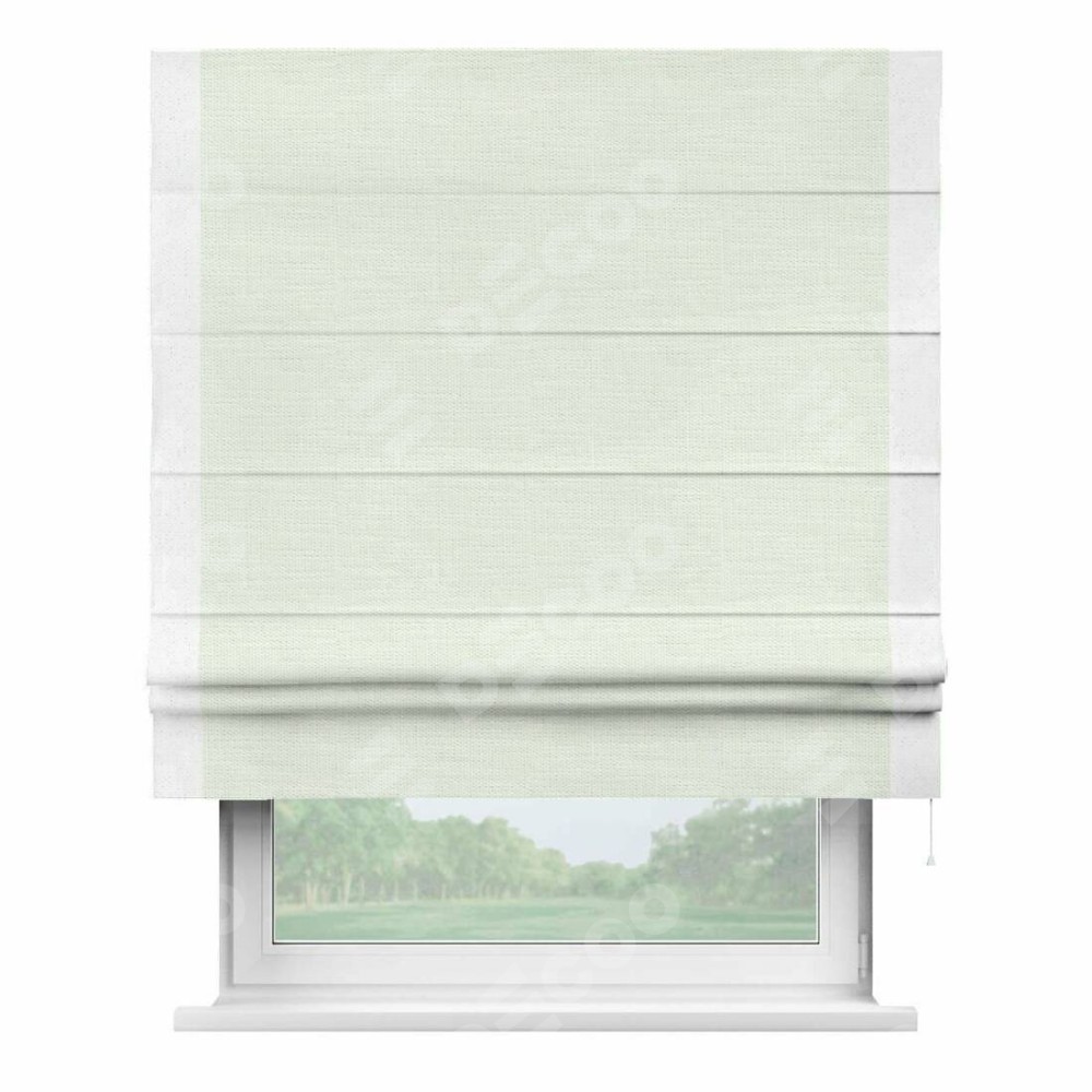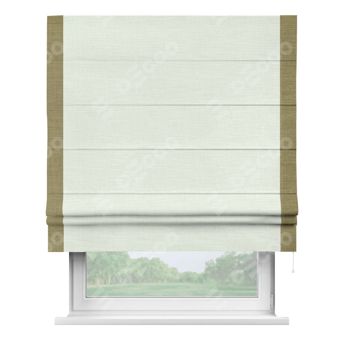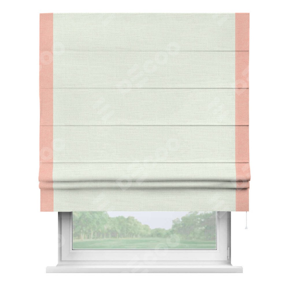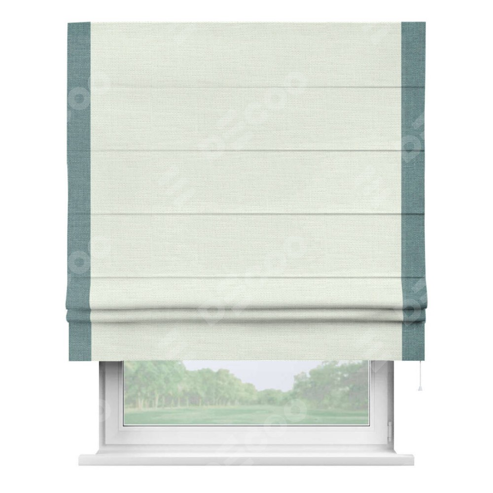Римская штора производителя «Cortin», используется для проёма, пошита из ткани лён молочный, артикул 23568. Отделка шторы кантом «Стрим Дуо», ткань для канта используется из льна разной расцветки на выбор. Имеет универсальный механизм и подходит для монтажа: на потолок, на стену и в нишу.