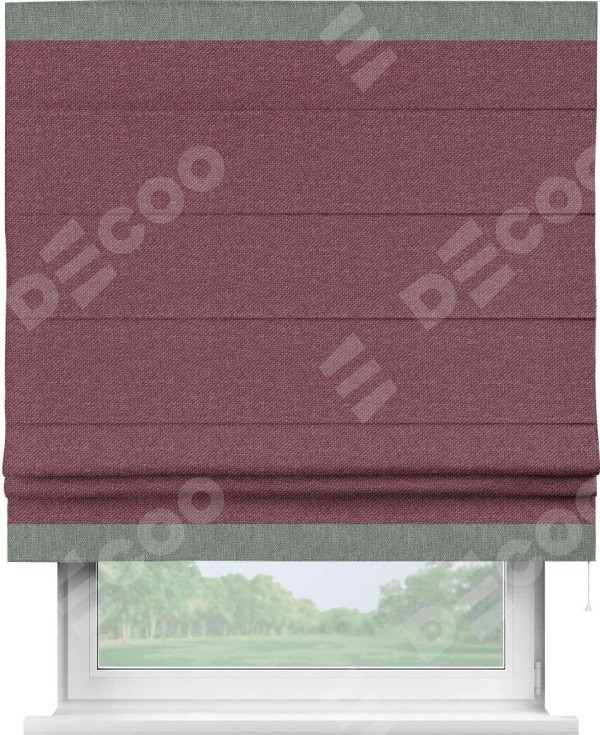 Римская штора производителя «Cortin», используется для проёма, пошита из ткани лён димаут марсала, артикул 1602. Отделка шторы кантом «Горизонт», ткань для канта используется из льна димаут разной расцветки на выбор. Имеет универсальный механизм и подходит для монтажа: на потолок, на стену и в нишу.