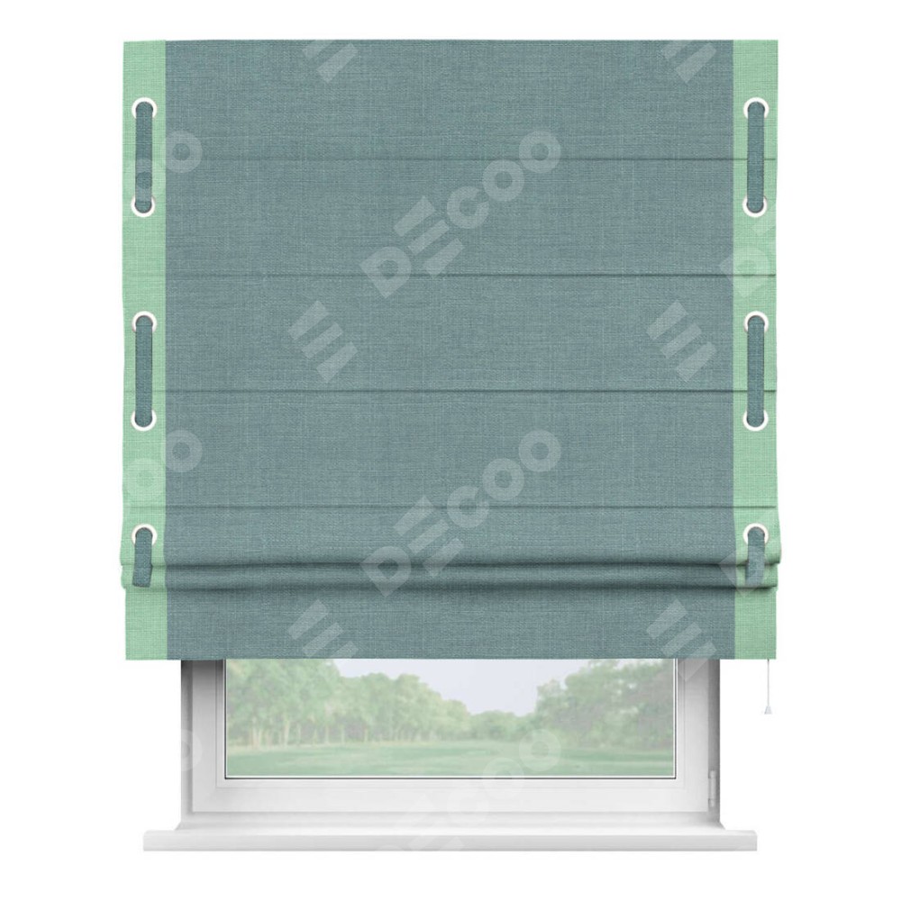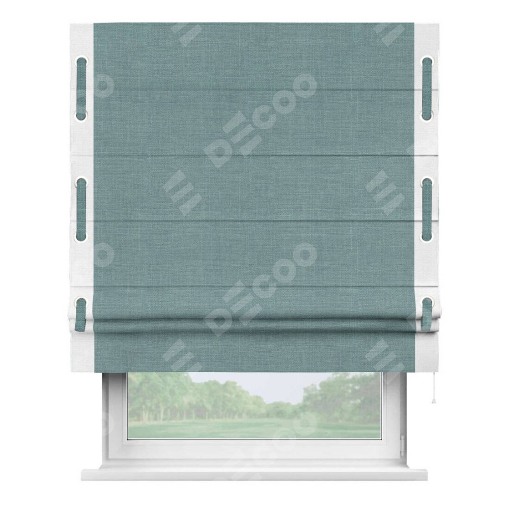 Римская штора производителя «Cortin», используется для проёма, пошита из ткани лён голубой, артикул 74736. Отделка шторы кантом «Стрим Дуо» на кантах расположены люверсы с пояском, ткань для канта используется из льна разной расцветки на выбор. Ткань для пояска обычно используется из основной ткани шторы, а так же можно сделать из любой расцветки по желанию. Имеет универсальный механизм и подходит для монтажа: на потолок, на стену и в нишу.