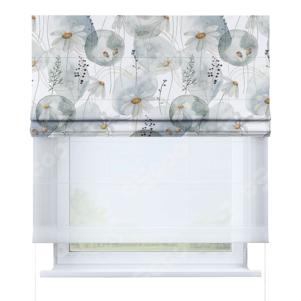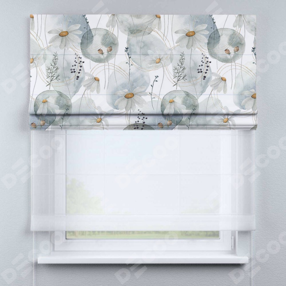 Римская штора день-ночь производителя «Cortin», используется для проёма, пошита из двух полотен, с лицевой блэкаут с нанесением сублимационной печати «Ромашки акварель», вторая ткань тюль (по стандарту комплектуется тюль белого цвета артикул V-01). Имеет универсальный механизм и подходит для монтажа: на потолок, на стену и в нишу.