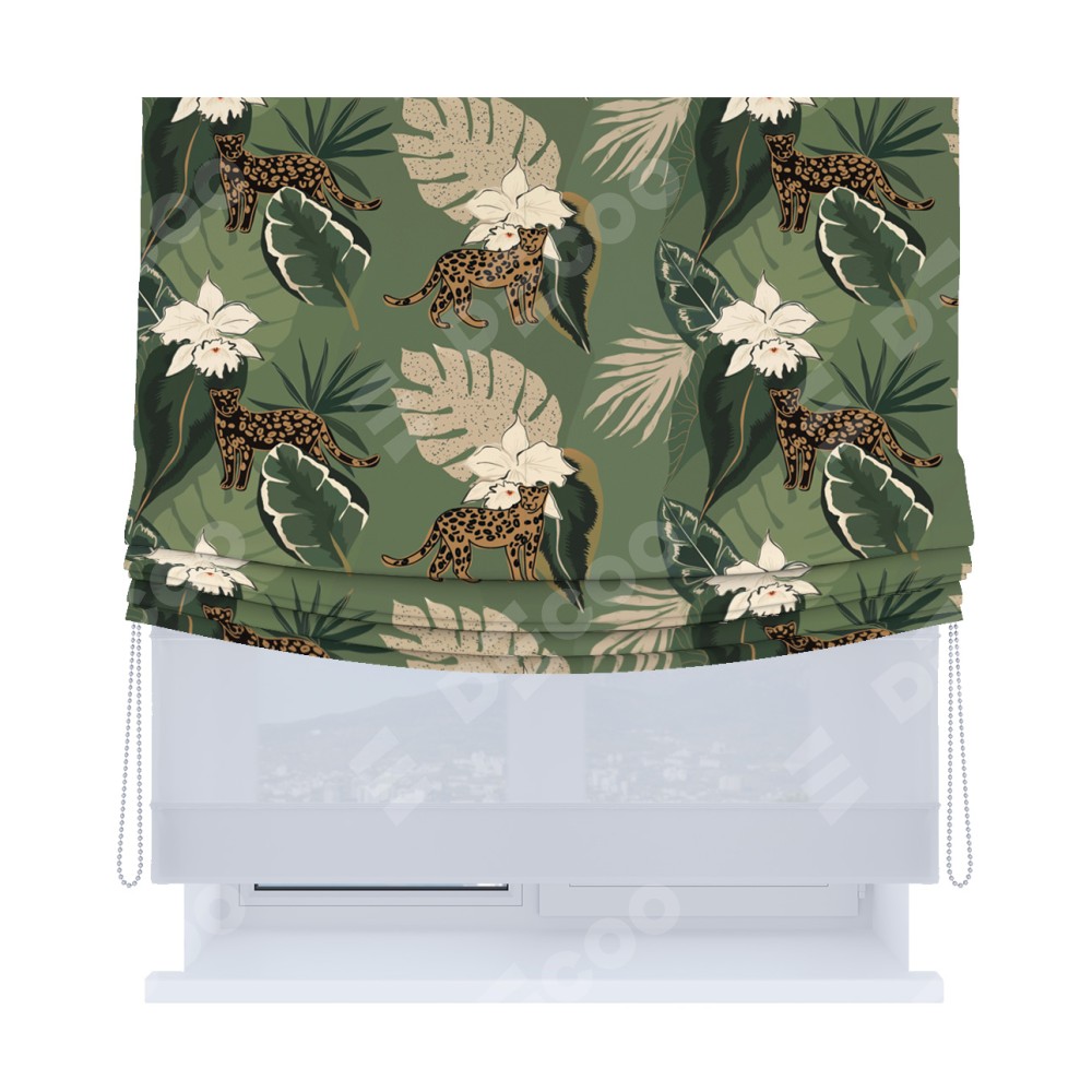Римская штора день-ночь производителя «Cortin», используется для проёма, пошита из двух полотен, с лицевой блэкаут с нанесением сублимационной печати «В тропическом лесу», вторая ткань тюль (по стандарту комплектуется тюль белого цвета артикул V-01). Имеет универсальный механизм и подходит для монтажа: на потолок, на стену и в нишу. Удобное управление каждой шторой отдельно.