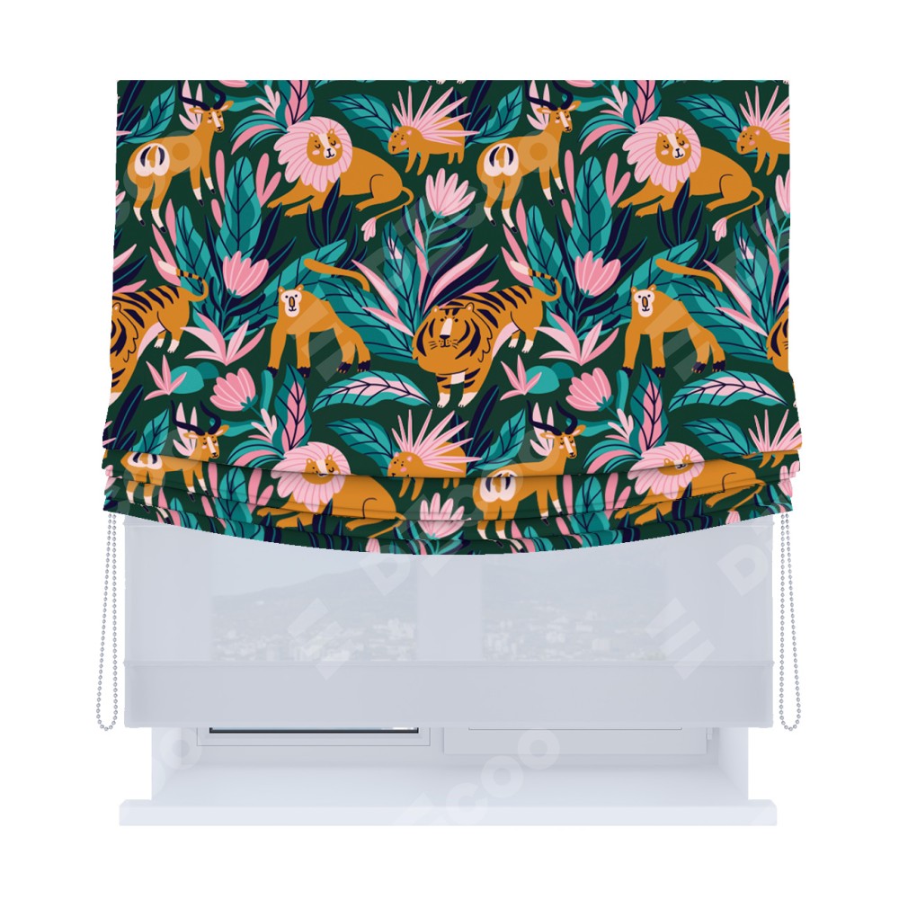 Римская штора день-ночь производителя «Cortin», используется для проёма, пошита из двух полотен, с лицевой блэкаут с нанесением сублимационной печати «Дикие животные», вторая ткань тюль (по стандарту комплектуется тюль белого цвета артикул V-01). Имеет универсальный механизм и подходит для монтажа: на потолок, на стену и в нишу. Удобное управление каждой шторой отдельно.
