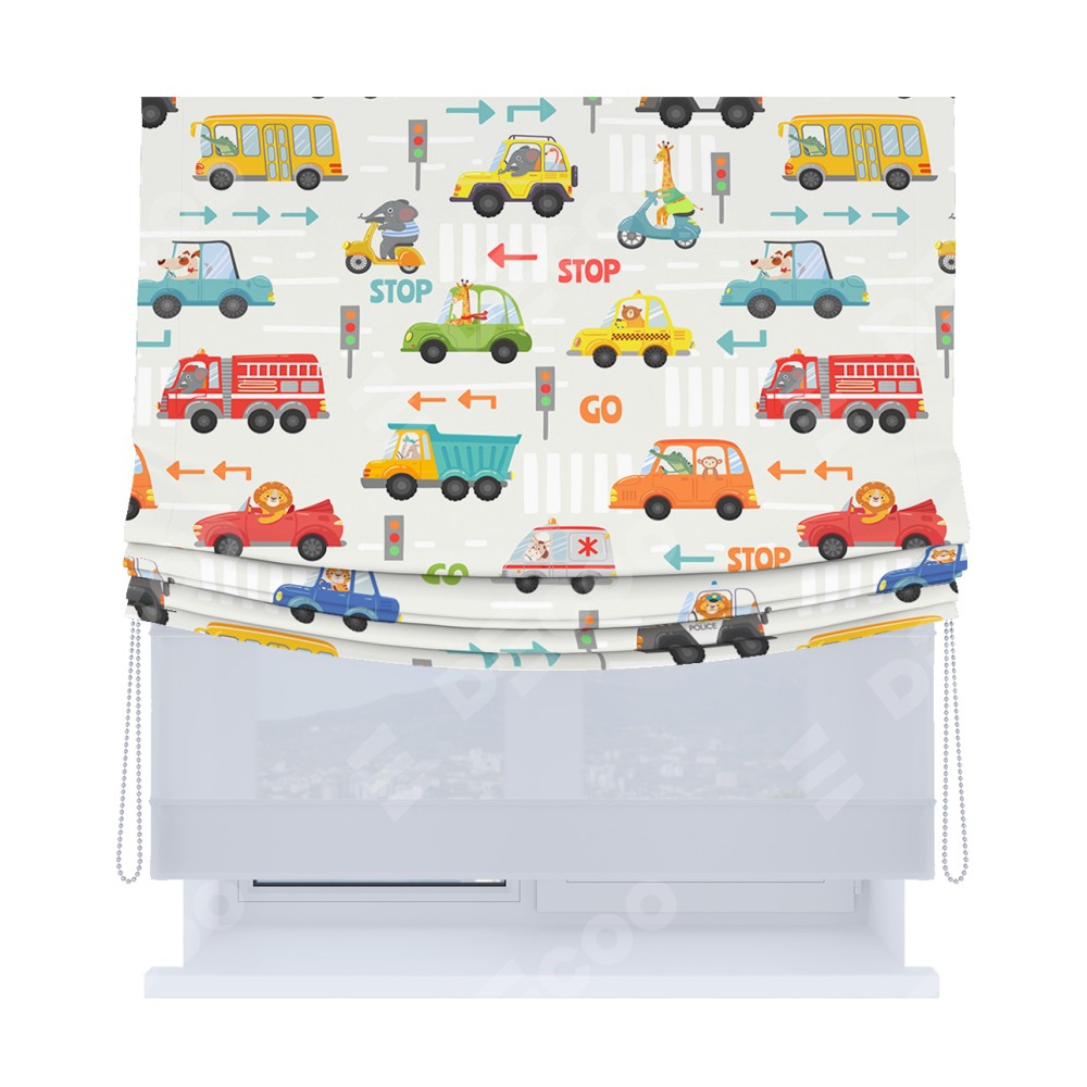 Римская штора день-ночь производителя «Cortin», используется для проёма, пошита из двух полотен, с лицевой блэкаут с нанесением сублимационной печати «Дорожные правила», вторая ткань тюль (по стандарту комплектуется тюль белого цвета артикул V-01). Имеет универсальный механизм и подходит для монтажа: на потолок, на стену и в нишу. Удобное управление каждой шторой отдельно.