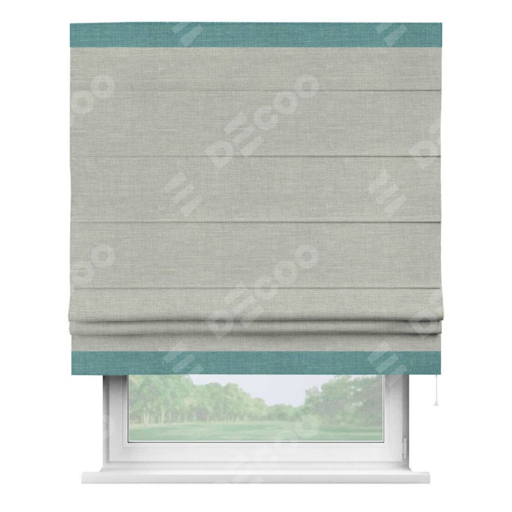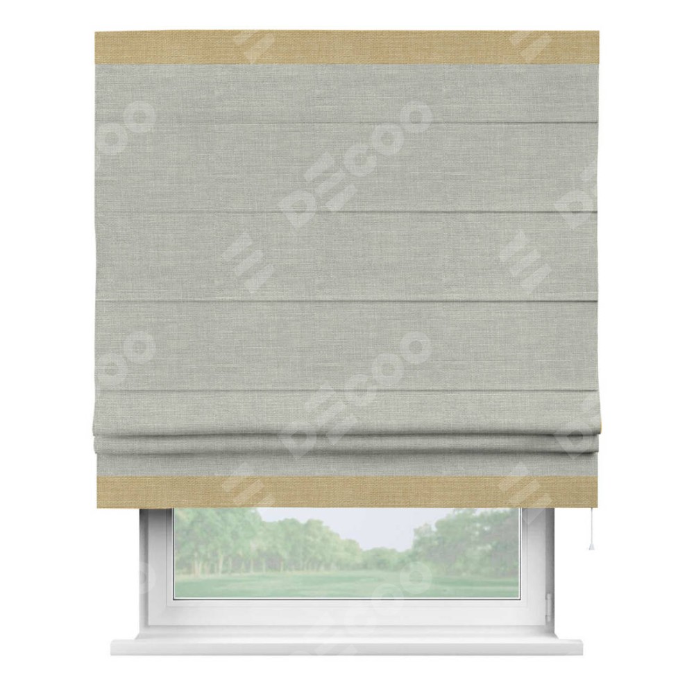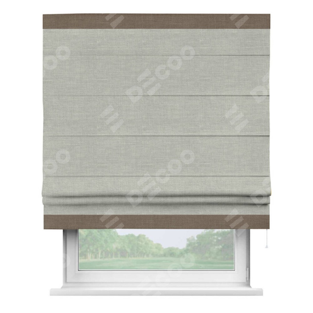 Римская штора производителя «Cortin», используется для проёма, пошита из ткани лён серый, артикул 7440. Отделка шторы кантом «Горизонт», ткань для канта используется из льна разной расцветки на выбор. Имеет универсальный механизм и подходит для монтажа: на потолок, на стену и в нишу.